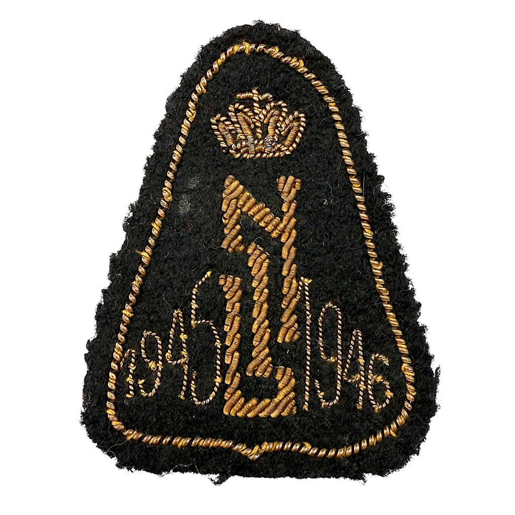 This Dutch KNIL “Voortrekkers” emblem is an interesting piece of military history from the 1945–1946 period. The triangular patch is made of black wool with gold-coloured hand-embroidered details, including the characteristic Voortrekkers monogram and a crown.