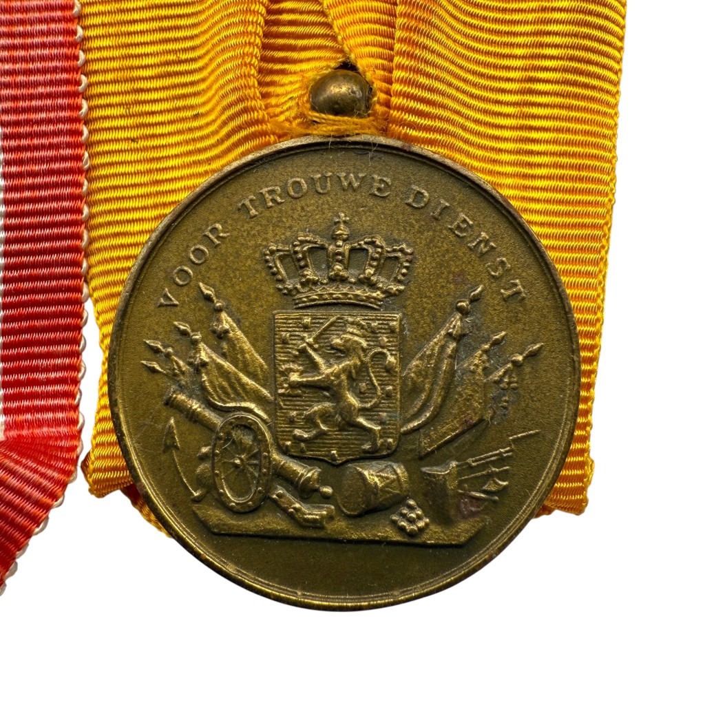 This bronze medal shows the Dutch national coat of arms with the inscription “Voor Trouwe Dienst” (“For Faithful Service”) and is suspended from the characteristic yellow ribbon.