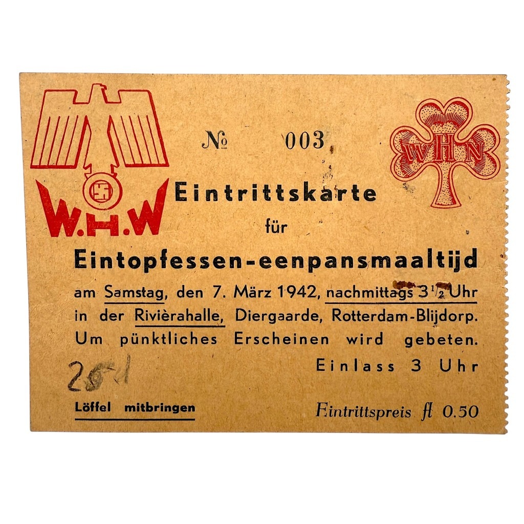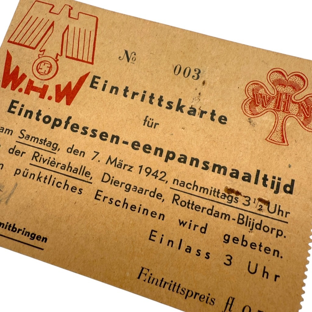 This admission ticket dates back to the Second World War and served as a WHW (Winterhilfswerk) entry pass for an “Eintopfessen – one-pot meal” held on Saturday, March 7, 1942, at the Rivierahal of the Rotterdam Zoo (Blijdorp).