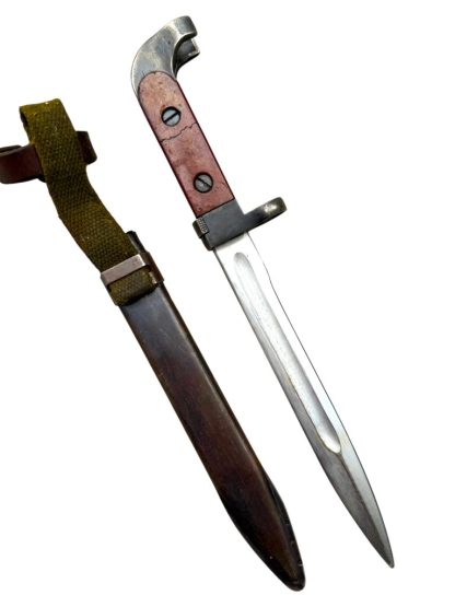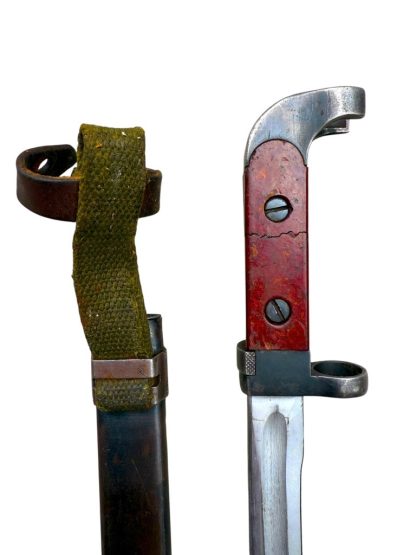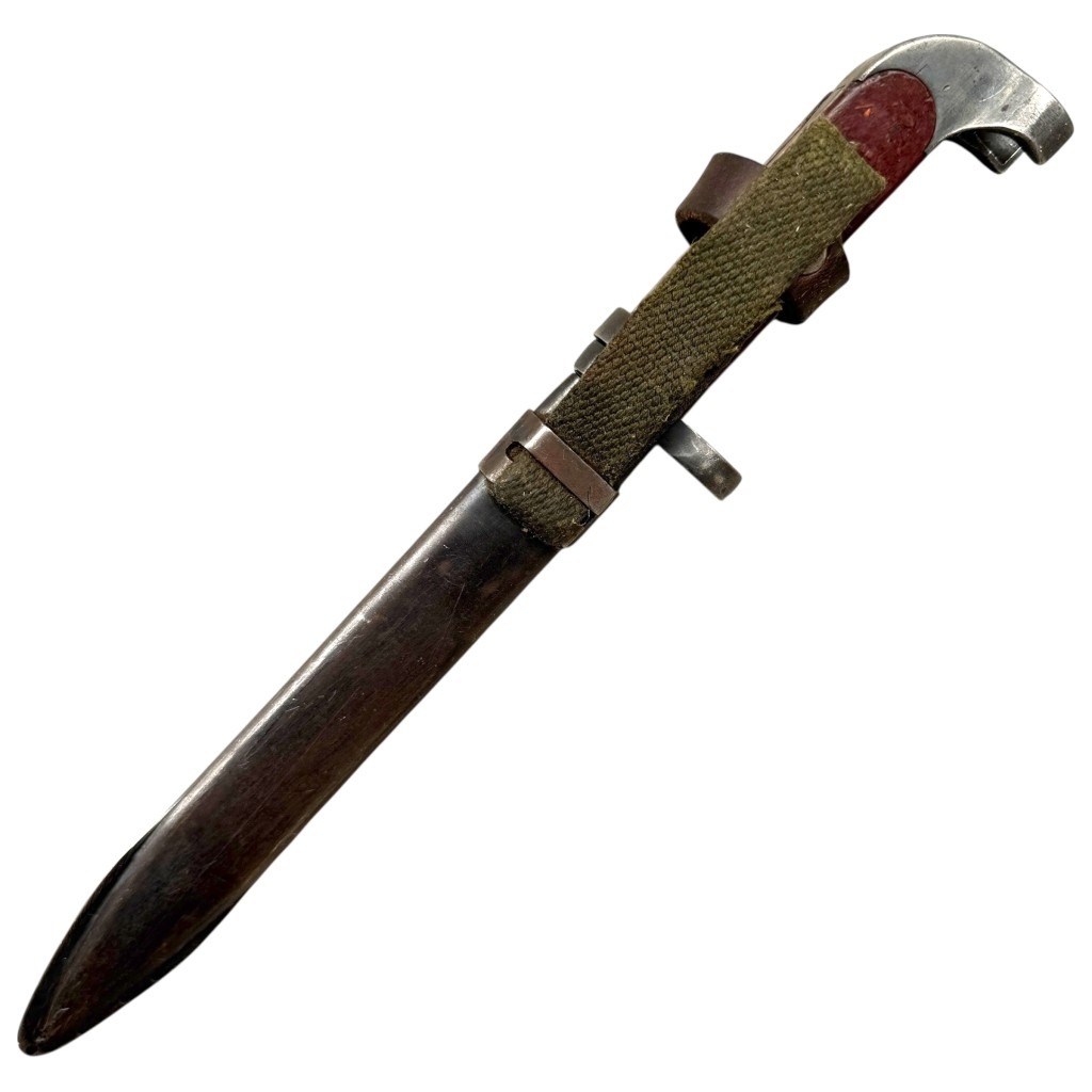 At the top, it includes a canvas hanger with a metal clip, allowing the bayonet to be attached to a belt or field gear.