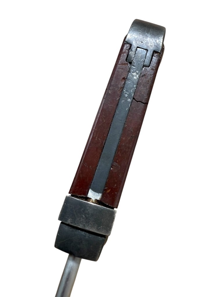 The crossguard features a barrel ring and a distinctive hooked locking mechanism at the top, ensuring secure attachment to the rifle. The handle is made of reddish-brown phenolic resin and has a rectangular profile, characteristic of this early production.