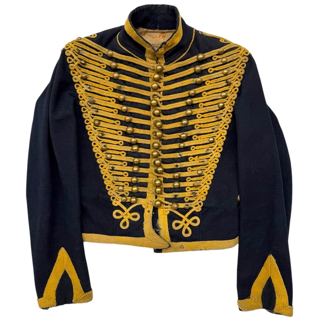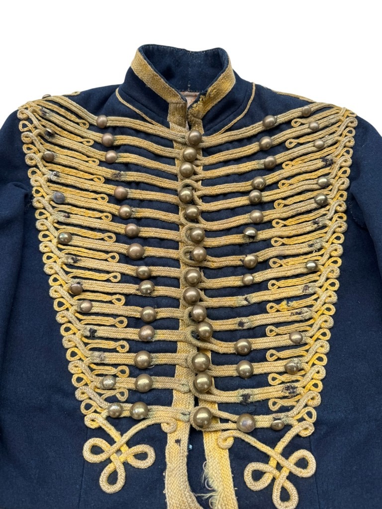 This dolman is executed in dark blue cloth and richly decorated with yellow wool cord hardware and brass buttons in the characteristic double row system.