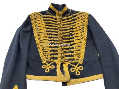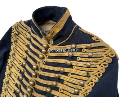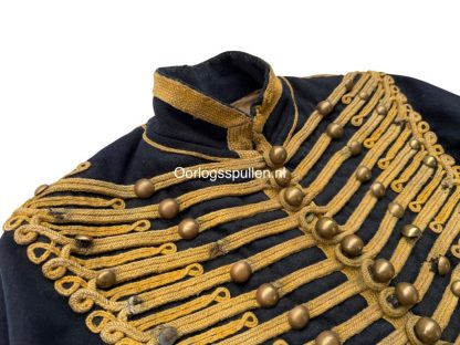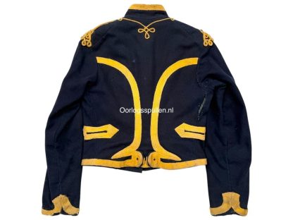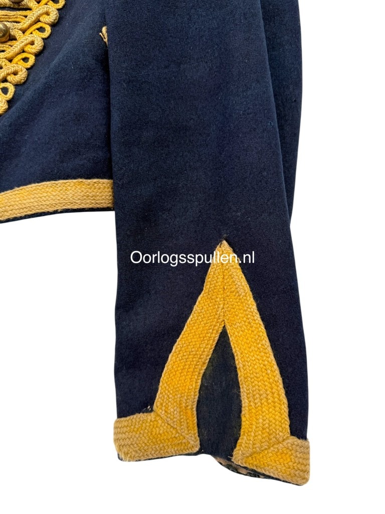Deze dolman is uitgevoerd in donkerblauw laken en rijkelijk versierd met geel wollen koordbeslag en messing knopen in het karakteristieke dubbele rijensysteem.