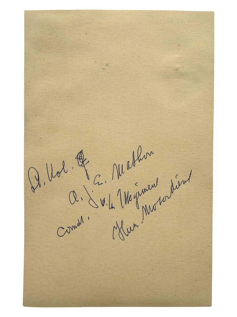 De foto toont Mathon in volledig uniform, met duidelijke details zoals de karakteristieke kraagspiegels, gespen en het leren draagstel. Op de achterzijde is zijn naam en functie met de hand genoteerd. Het 2e Regiment Huzaren Motorrijders speelde in mei 1940 een opvallende rol binnen de Nederlandse verdediging. Vanuit de Frederik-Hendrikkazerne te Vught trok het regiment op 10 mei naar Mill, waar het zich met succes verzette tegen een Duits infanteriebataljon. Voor het moedige optreden tijdens deze gevechten werden meerdere dapperheidsonderscheidingen uitgereikt, waaronder drie Bronzen Leeuwen en een Bronzen Kruis. Tijdens de daaropvolgende terugtocht richting Noord-Brabant en later naar de Alblasserwaard raakte het regiment verspreid door vijandelijke luchtaanvallen, waarna delen van 2 R.H.M. verder vochten op het Eiland van Dordrecht, in de Alblasserwaard en in Gouda.