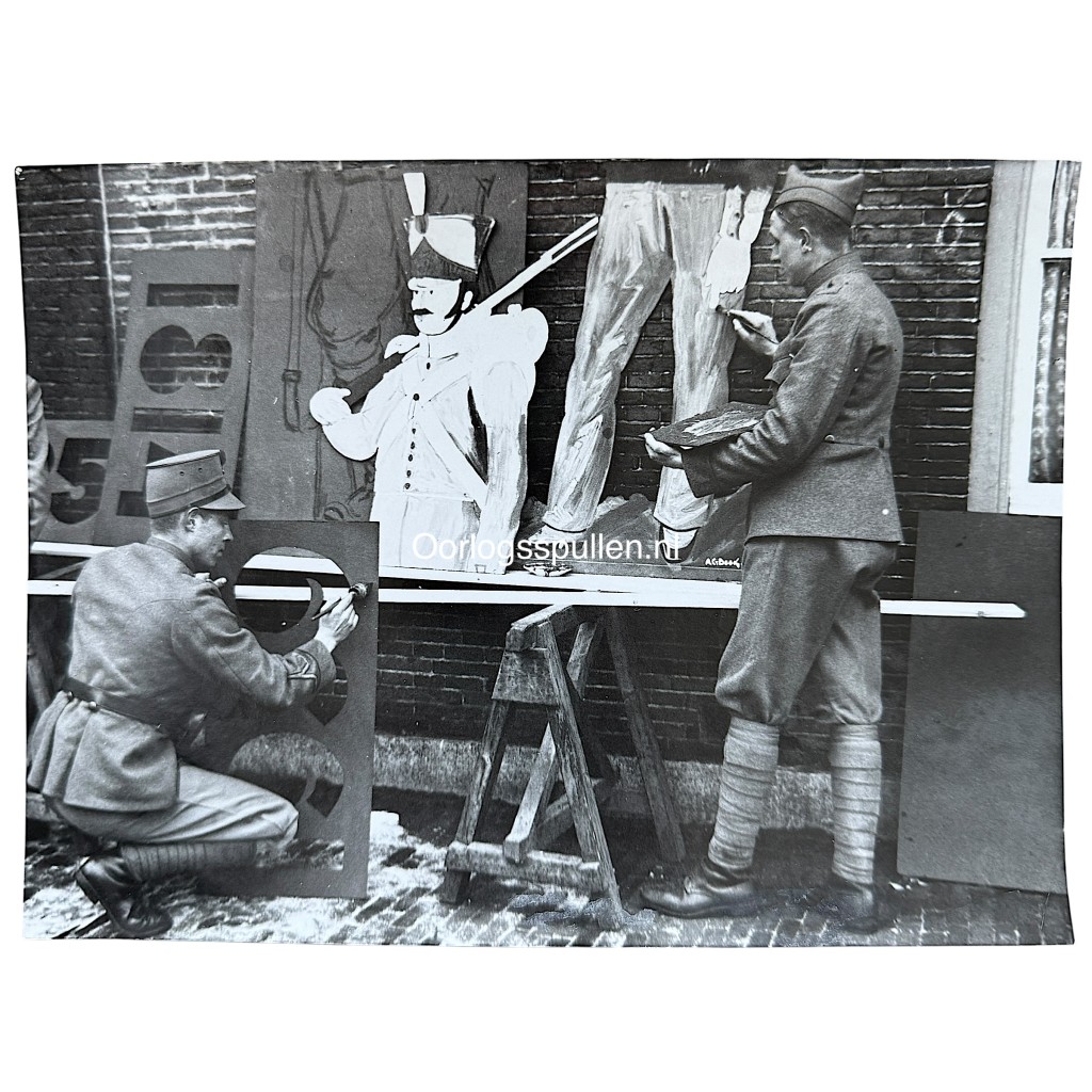 Deze Nederlandse groot formaat legerfoto uit de periode vóór 1940 toont twee Nederlandse militairen in uniform die bezig zijn met het schilderen van grote borden en figuren. Links wordt met een sjabloon een groot cijfer aangebracht, terwijl rechts een soldaat bezig is een uniform figuur te beschilderen.