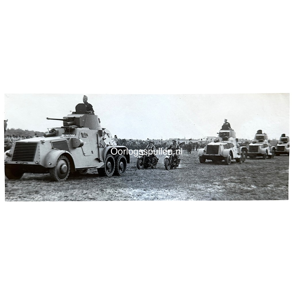 Pre-1940 foto van het Nederlands leger met Landsverk M38 pantserwagens tijdens een militaire parade of oefening.