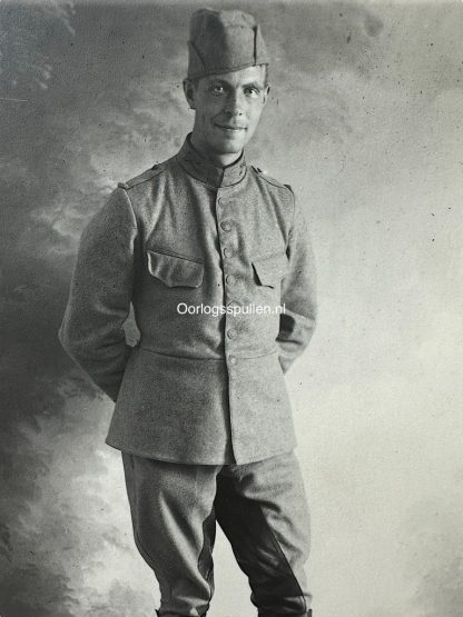 Deze Nederlands leger foto is in goede conditie, dateert van september 1939 en daarop is een Nederlands militair van de Artillerie op te zien in zijn grove wollen manschappen uniform.