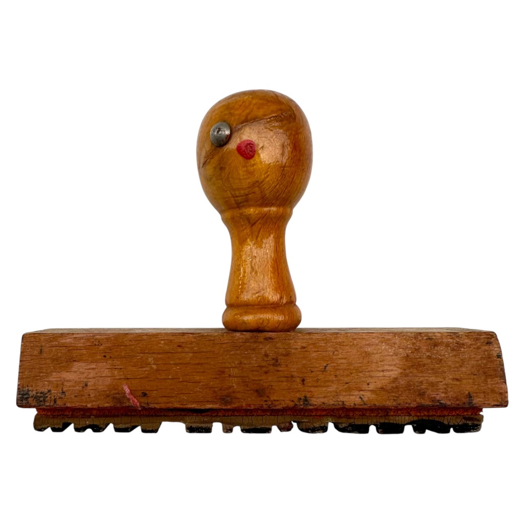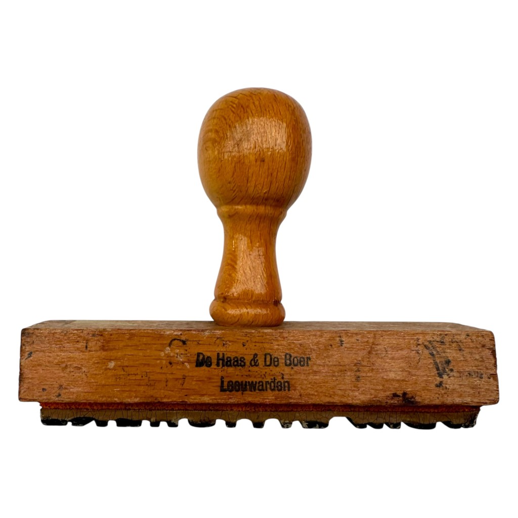 The stamp has a classic wooden handle and base, with the maker’s mark “De Haas & De Boer – Leeuwarden” on the underside, a well-known supplier of stamps and administrative tools from that era. For clarity, we have included one mirrored photo so the text can be read more easily and the stamp impression can be properly interpreted.