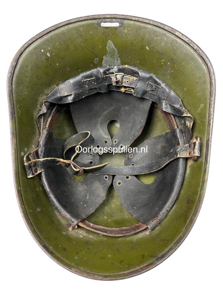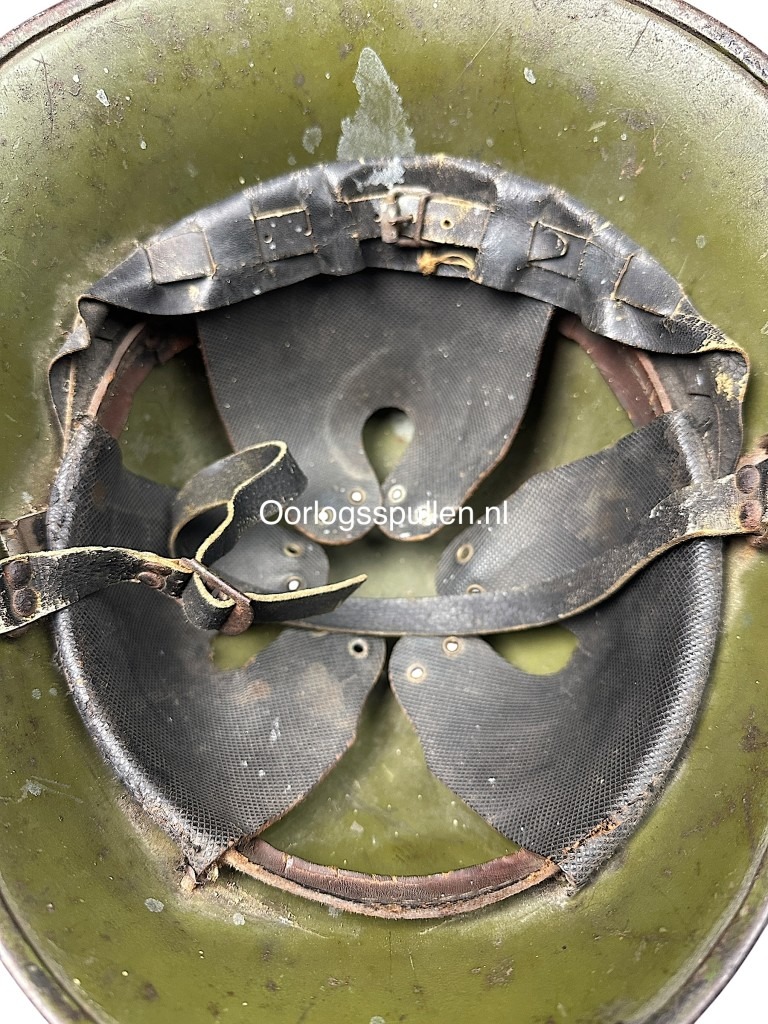 This Pre 1940 Dutch M34 Army helmet is in worn condition and on the inside the interior and chin strap are also still present.