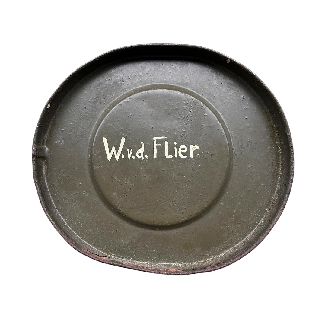 Het deksel sluit solide en is voorzien van handgeschilderde markeringen, waaronder het registratienummer Z III-6728 en de naam W. v.d. Flier, wat duidt op persoonlijke uitgifte aan een militair uit de mobilisatieperiode vóór de Tweede Wereldoorlog.
