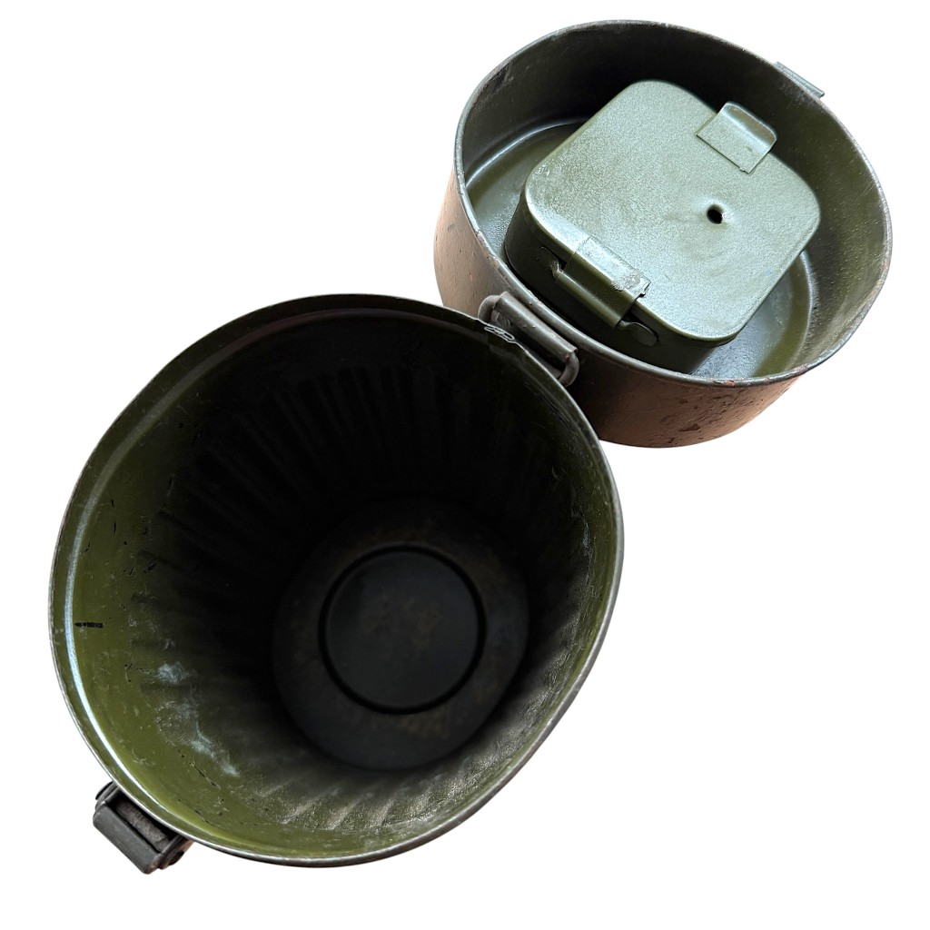 Deze zeldzame Nederlandse Mariniers Pre-1940 gasmaskerbus is in goede conditie en bus is uitgevoerd in klassiek defensiegroen en is vervaardigd uit stevig metaal met kenmerkende verticale ribbels die zorgen voor extra stevigheid en herkenbaarheid.