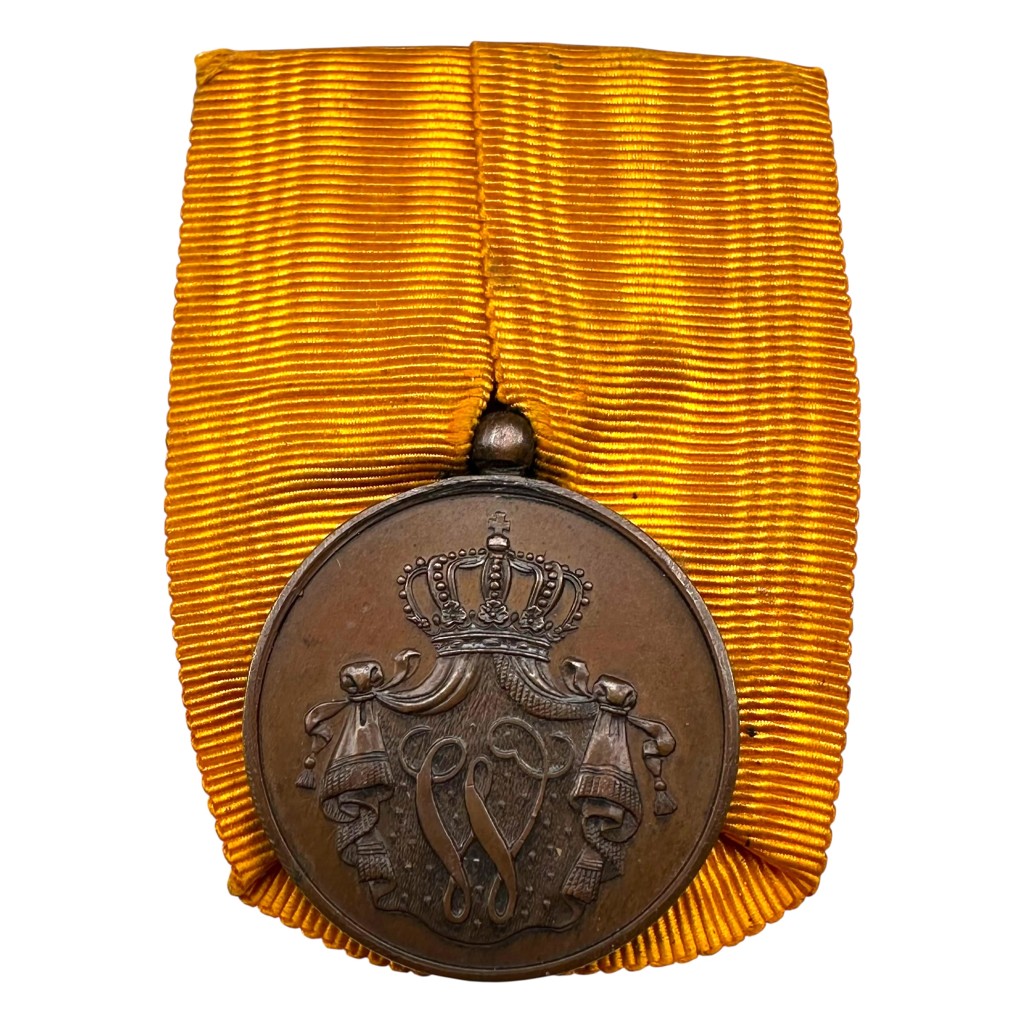 This original bronze “For Faithful Service” medal of the Royal Netherlands Navy is a beautiful example from the pre-1940 period, awarded to naval personnel after 12 years of loyal and exemplary service. The medal is suspended from the characteristic yellow ribbon.