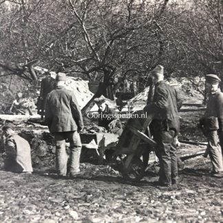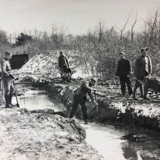 Op de foto zijn Nederlandse soldaten soldaten hun stellingen aan het bouwen.