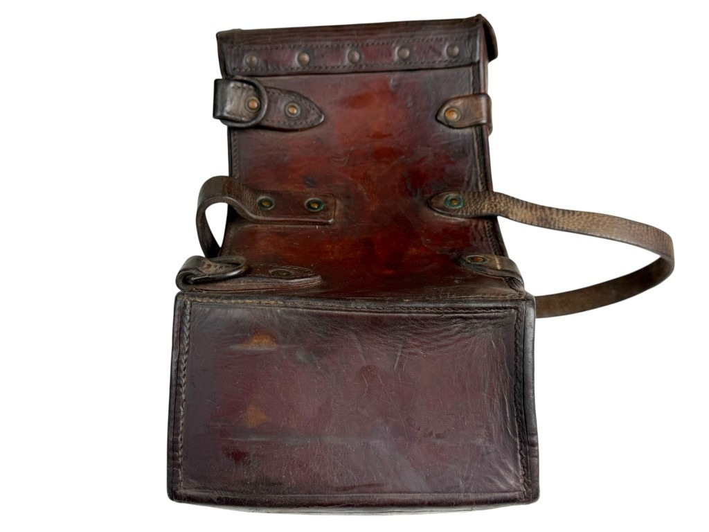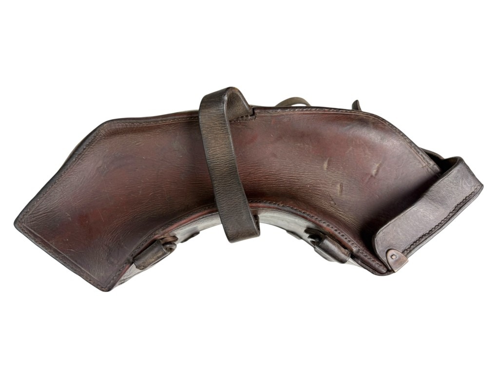 The pouch is made of thick and durable brown leather, reinforced with metal fittings and sturdy straps, ensuring the heavy curved Madsen magazines could be carried securely.