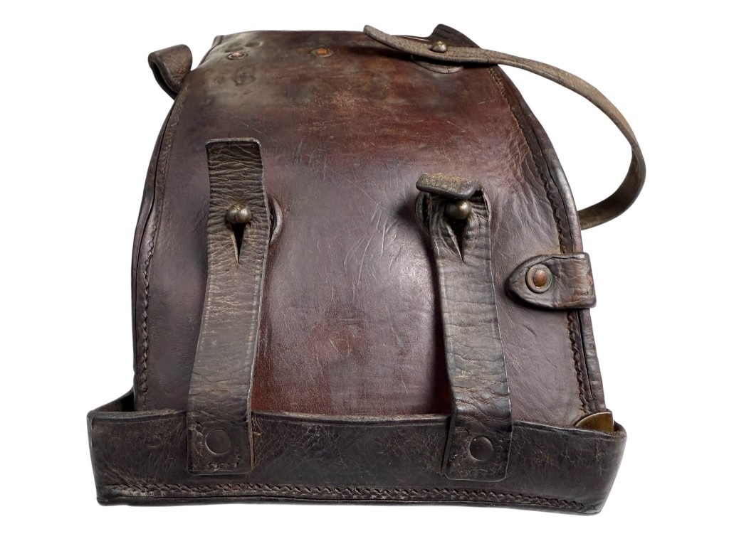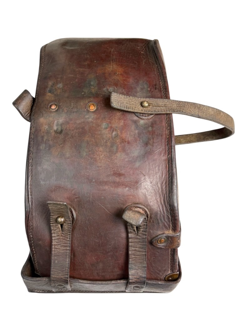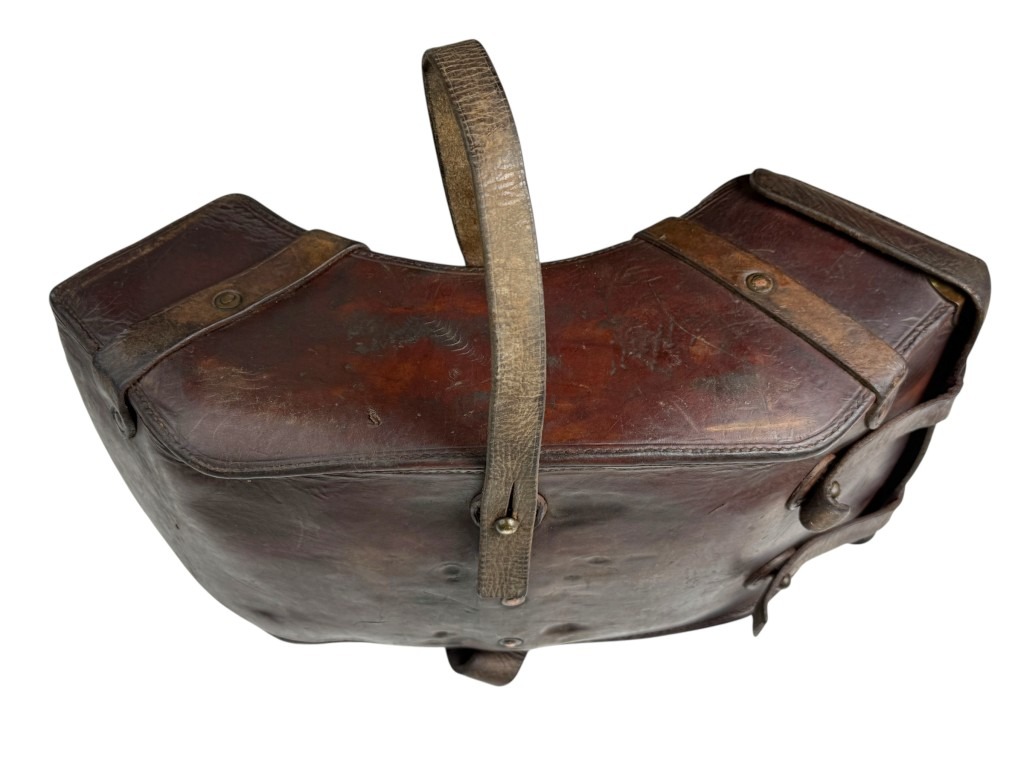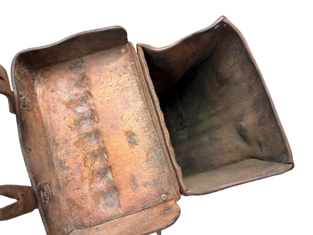 De tas is vervaardigd uit dik en duurzaam bruin leer, versterkt met metalen beslag en stevige riemen, zodat de zware gebogen Madsen-magazijnen veilig vervoerd konden worden.