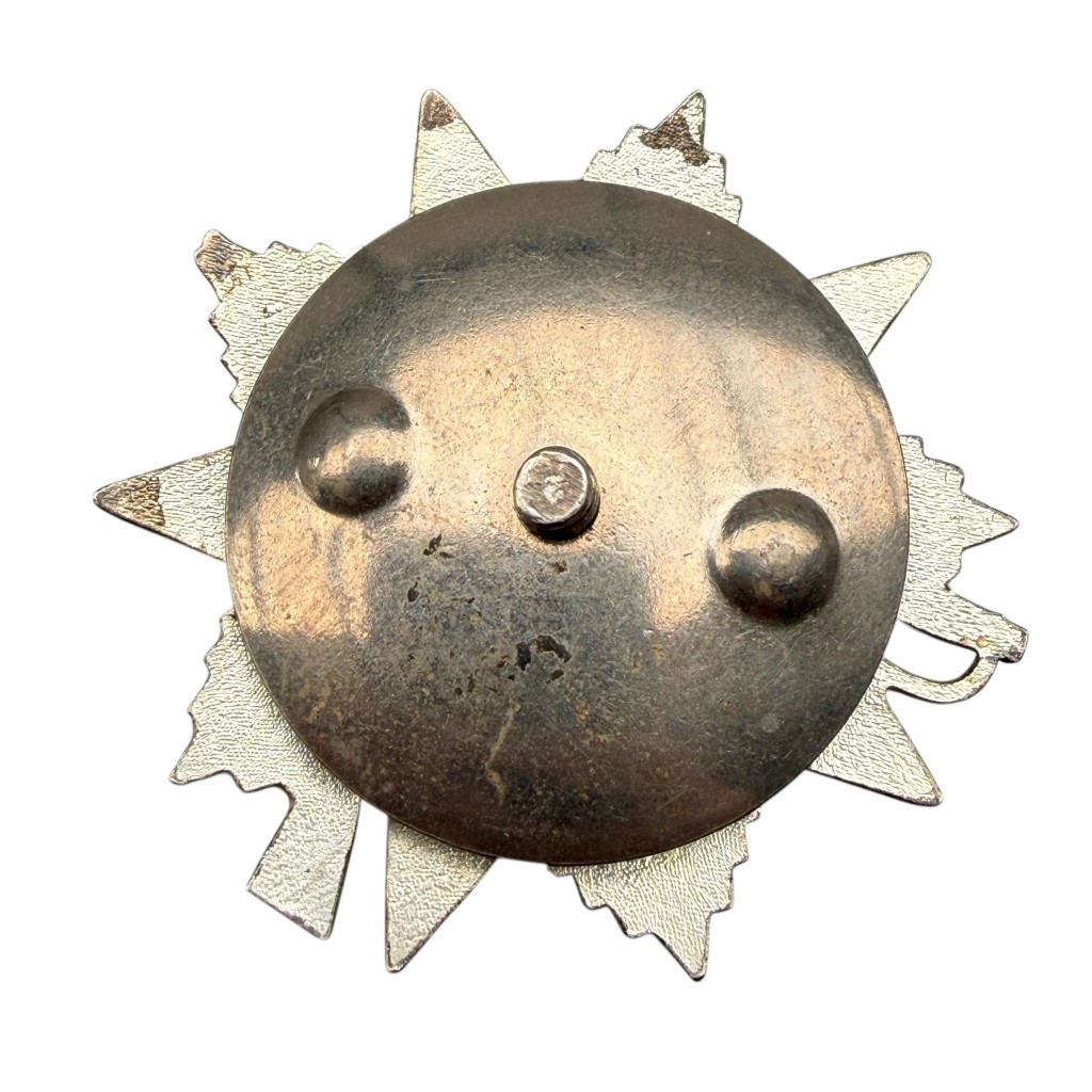 Het betreft een fraai uitgevoerd exemplaar met rood geëmailleerde ster en centraal hamer en sikkel symbool.