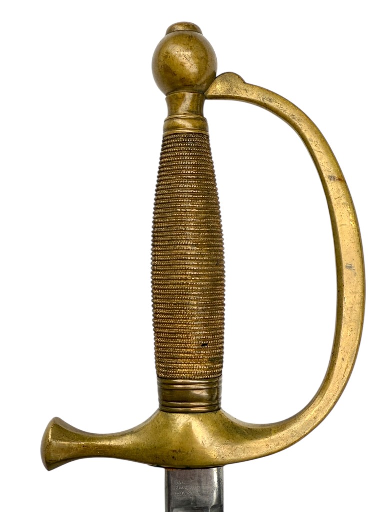 De sabel heeft een messing gevest met fijn geribbelde greep en een rechte, gepolijste stalen kling.