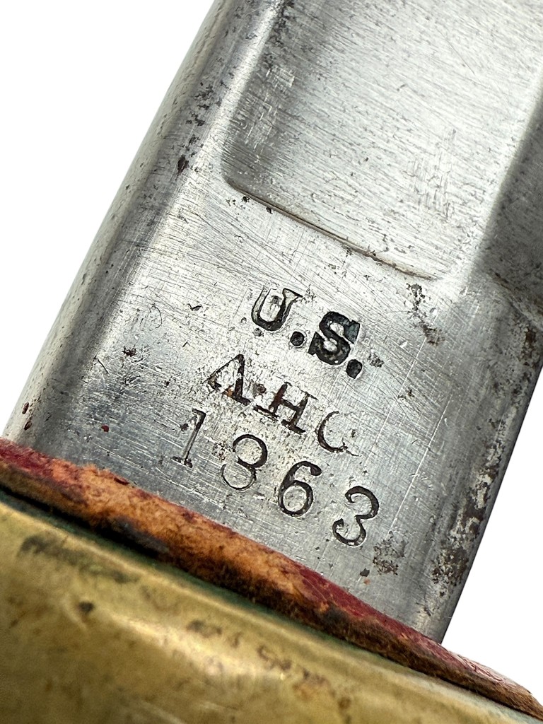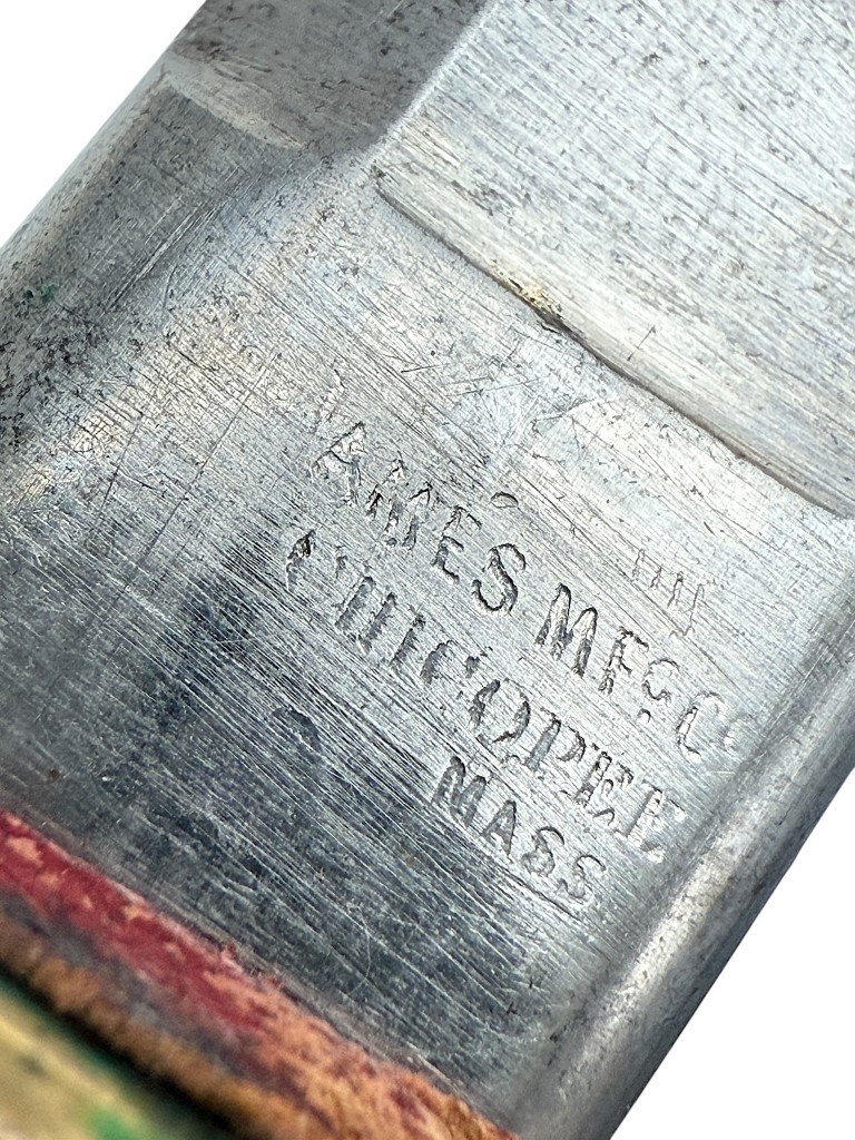 The sword is clearly marked “U.S. AHC 1863” on one side of the ricasso (with AHC being the inspector’s mark) and “Ames Mfg. Co. Chicopee, Mass.” on the other, the well-known American manufacturer of military weapons in the 19th century.