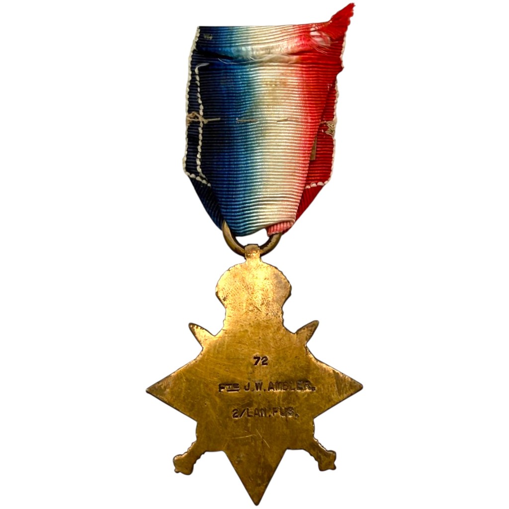 The medal is named and engraved “PTE J.W. AMBLER 2/LAN: FUS.”.