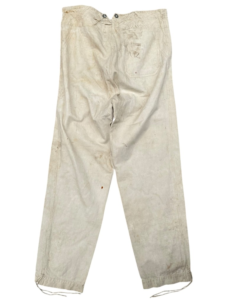 These trousers are made from sturdy cotton and show clear signs of use consistent with military service.