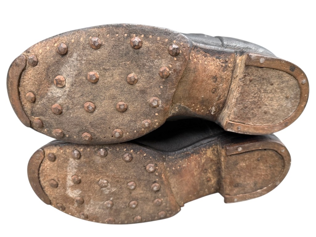 These German marching boots from the First World War are made of sturdy black leather and feature the characteristic construction of the Imperial German Army, with reinforced toes, leather soles fitted with metal hobnails, and heel plates for extra grip during long marches.