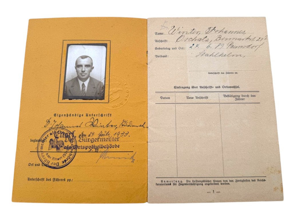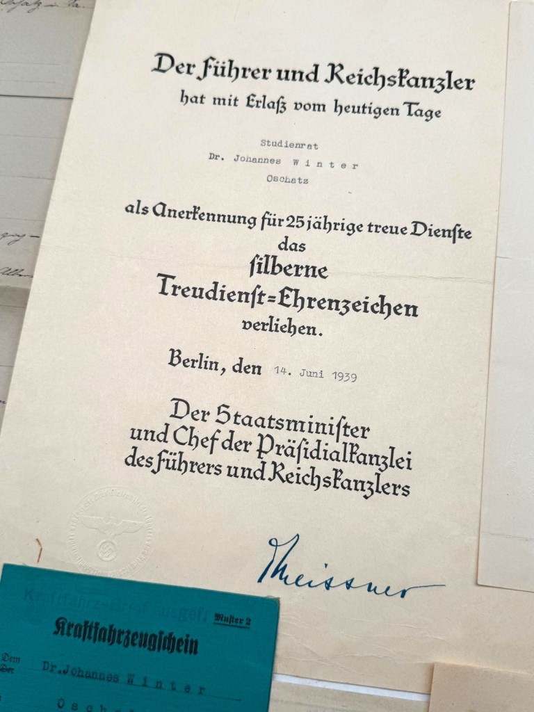 Deze documenten tonen zijn betrokkenheid bij veteranenorganisaties in de jaren tussen de oorlogen. Tijdens de Tweede Wereldoorlog bekleedde Winter de rang van Hauptmann en fungeerde hij als Wehrmachtstandortältester in Oschatz, ressorterend onder Wehrkreis IV (Dresden). In de groep bevindt zich de originele oorkonde voor het Kriegsverdienstkreuz 2. Klasse mit Schwertern (Dresden, 30 januari 1944), uitgereikt door de stellvertretende Kommandierende General des IV. Armeekorps. Verder omvat de set een Wehrmacht-Führerschein, een Kraftfahrzeugschein, officiële persoonsbewijzen met pasfoto en vingerafdrukken, en aanvullende militaire legitimaties. De verschillende foto’s tonen Winter zowel in burgerkleding als in uniform. Daarnaast is een Hongaarse legitimatie (Wenen, 19 september 1941) aanwezig betreffende een herinneringsmedaille voor deelname aan de Eerste Wereldoorlog, wat wijst op internationale erkenning van zijn oorlogsdeelname. De documenten verkeren in originele staat met normale ouderdomssporen. Originele stempels en handtekeningen zijn duidelijk zichtbaar. De set is jarenlang samen bewaard gebleven.