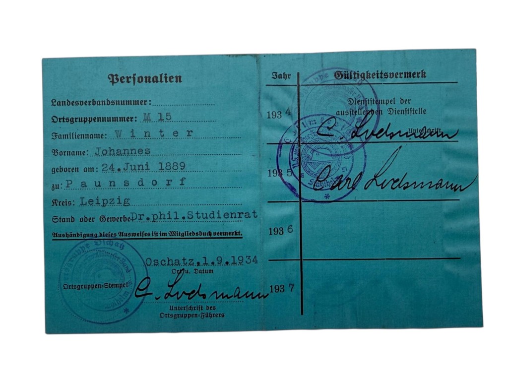 In the interwar period, Winter worked as a Studienrat (academically trained secondary school teacher) in Oschatz. For 25 years of loyal service, he received the Silver Faithful Service Decoration on June 14, 1939. He was also a member of “Der Stahlhelm – Bund der Frontsoldaten”; included are his membership booklet, an award certificate (joined August 25, 1925), and contribution stamp booklets from 1934–1935 with original official stamps. These documents reflect his involvement in veterans’ organizations during the interwar years.