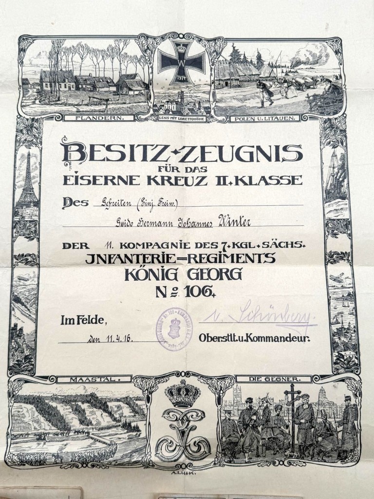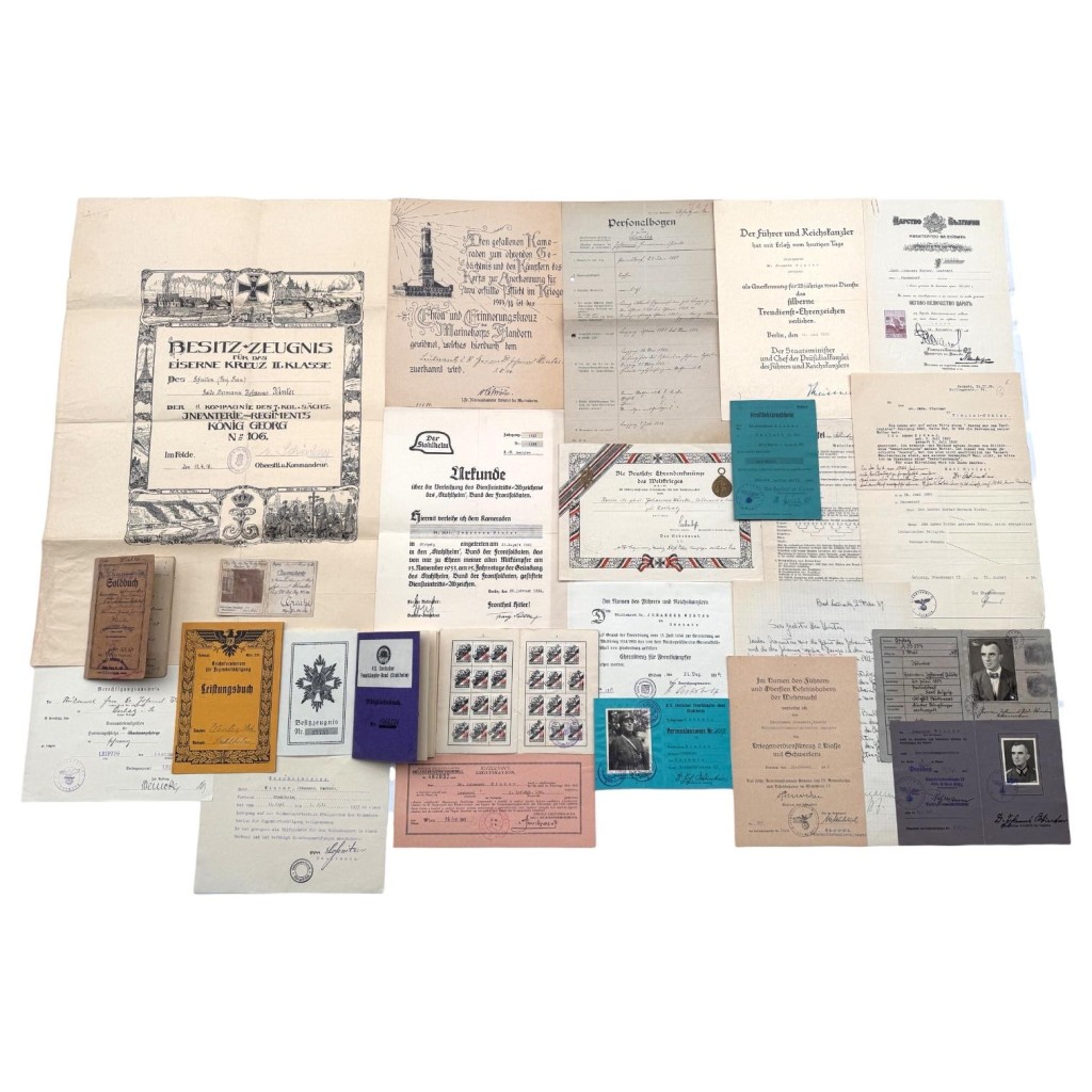 Zijn frontdienst liep van 1915 tot 1918; hij raakte eenmaal gewond. In de groep bevindt zich het originele Besitz-Zeugnis voor het Eisernes Kreuz II. Klasse (11 april 1916), fraai uitgevoerd met decoratieve veldscènes en regimentsvermelding. Daarnaast zijn aanwezig een Ausweiskarte uit Leipzig (18 april 1918) met handtekening, het Ehren- und Erinnerungskreuz des Marinekorps Flandern, de Deutsche Ehrendenkmünze des Weltkrieges en het Ehrenkreuz für Frontkämpfer (1934). Deze stukken documenteren zijn actieve frontverleden en latere erkenning als veteraan.
