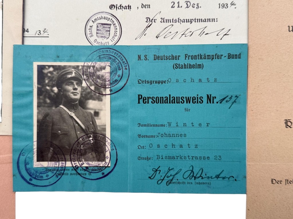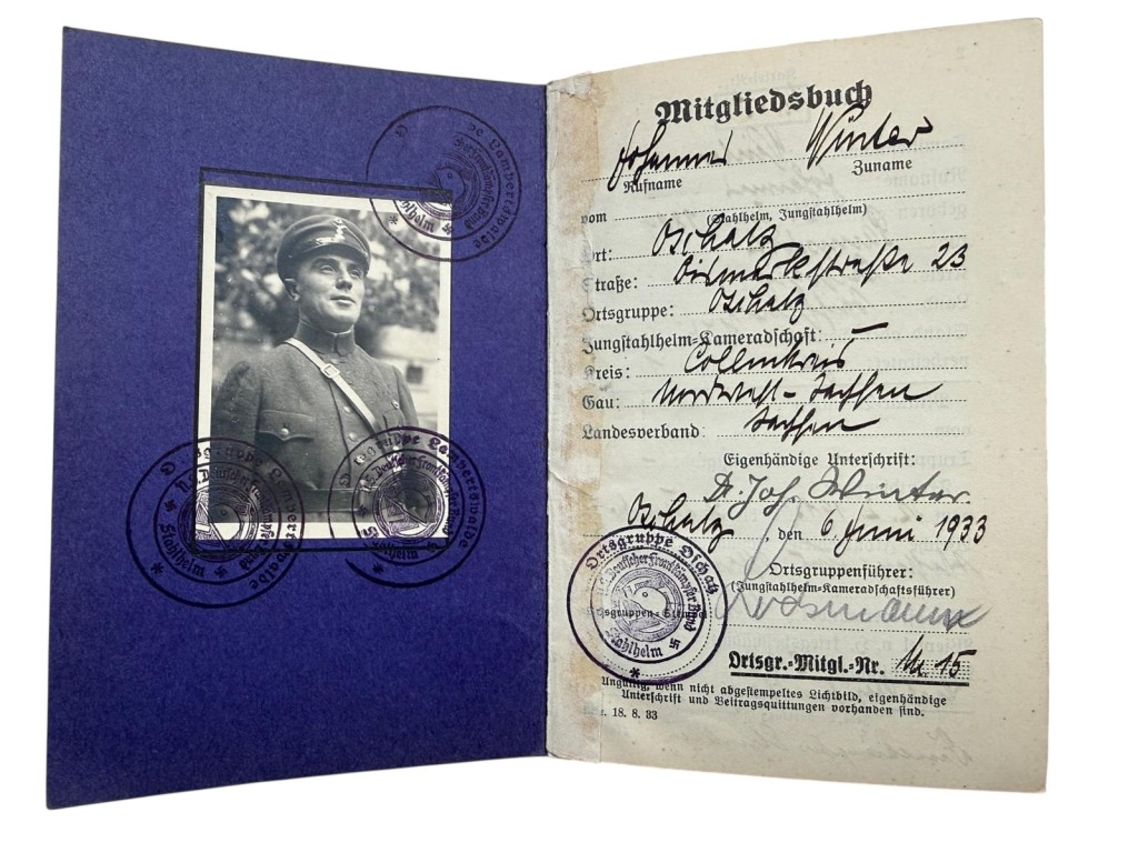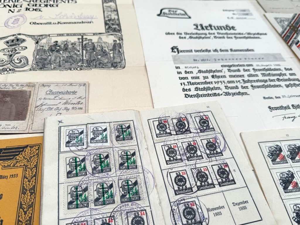 Tevens was hij lid van “Der Stahlhelm – Bund der Frontsoldaten”; aanwezig zijn zijn lidmaatschapsboek, een oorkonde (toetreding 25 augustus 1925) en contributieboekjes 1934–1935 met originele, gestempelde zegels.