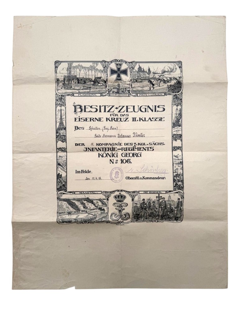 His front-line service lasted from 1915 to 1918, during which he was wounded once. Included in the group is the original award certificate (Besitz-Zeugnis) for the Iron Cross 2nd Class, dated April 11, 1916, attractively designed with decorative battle scenes and regimental references.
