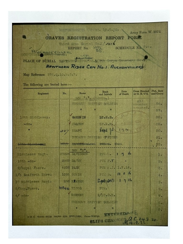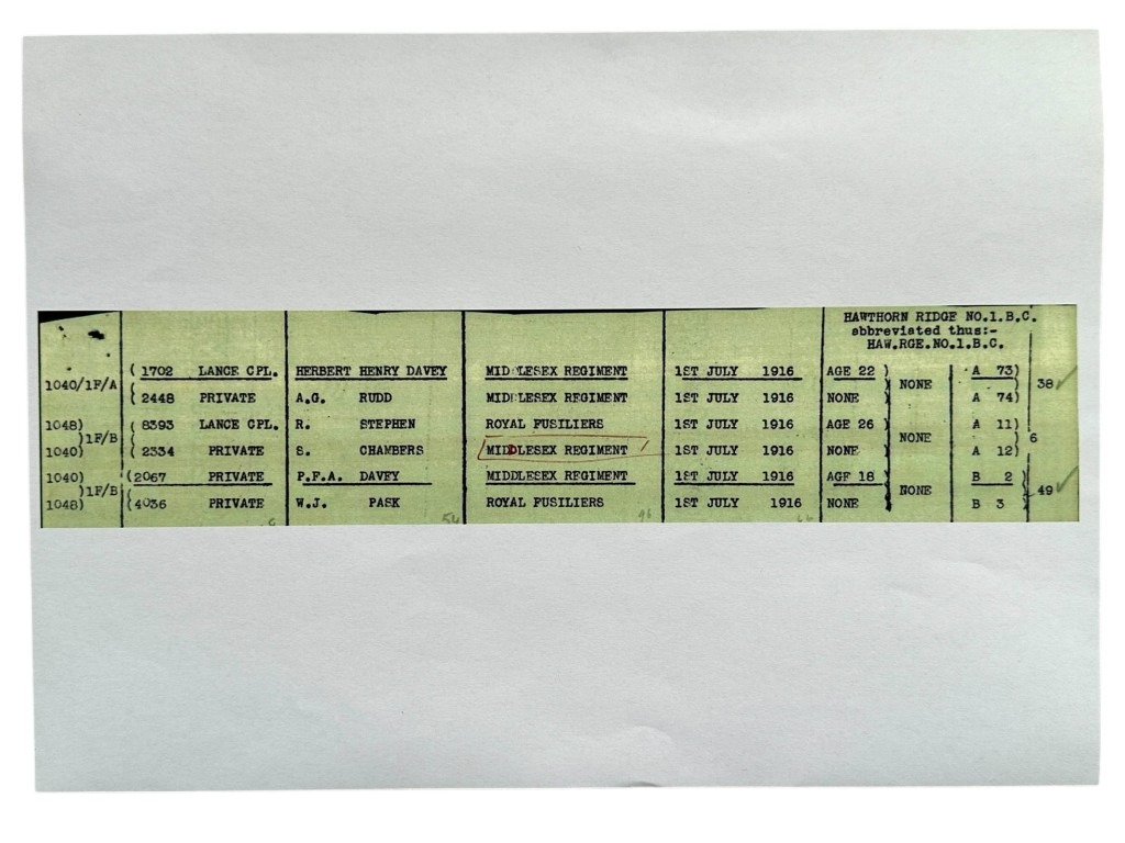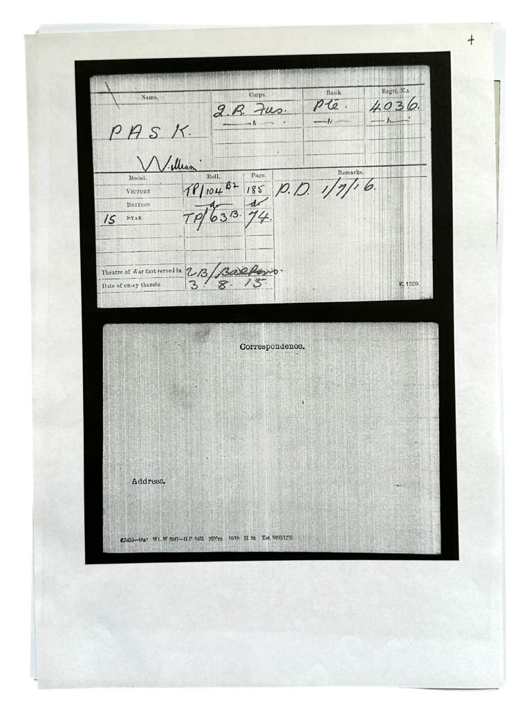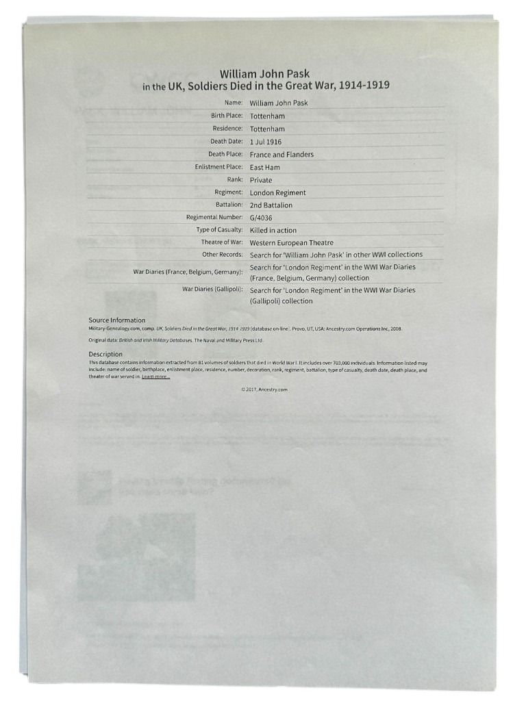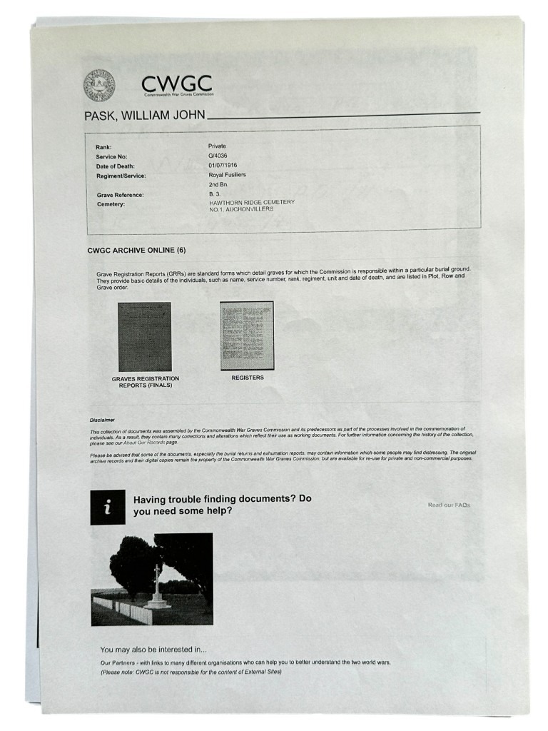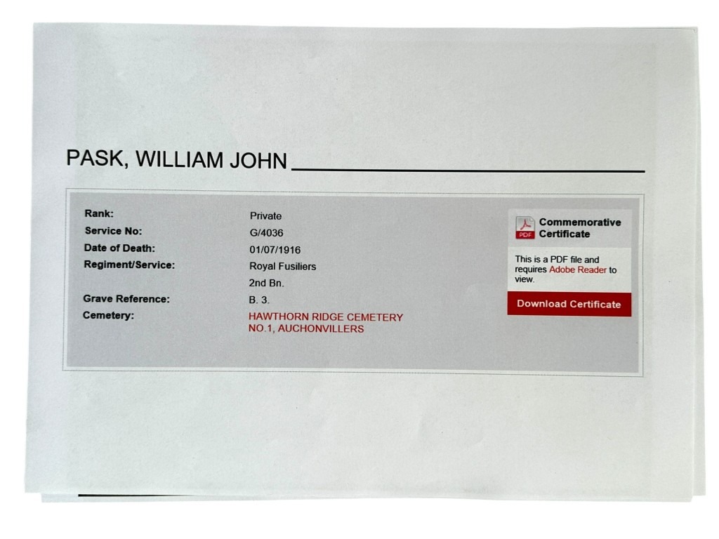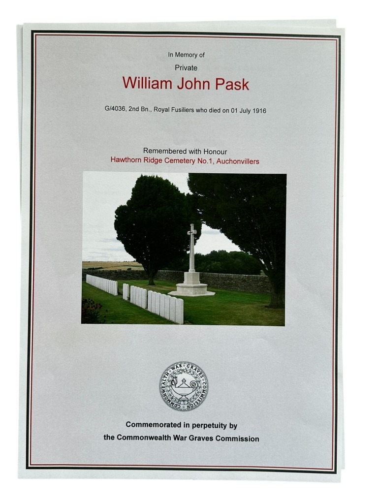 William John Pask served is the 2nd Bn Royal Fusilliers and he is buried in the Hawthorn Ridge cemetery in Auchonvillers.