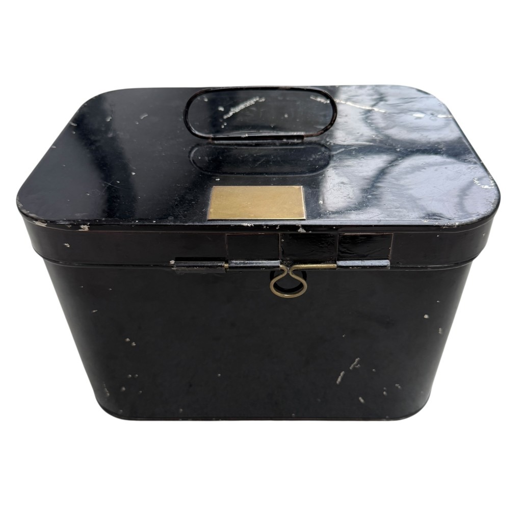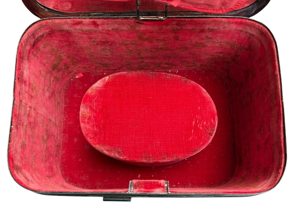 The sturdy metal carrying case with brass clasp and handle is lined with red velvet on the inside, which remains intact despite signs of age.