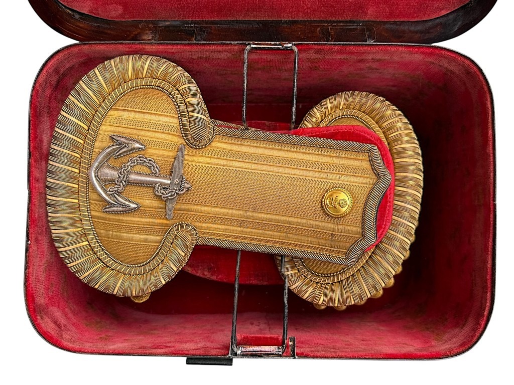 This is a complete pair of British Navy epaulettes from the First World War, preserved in their authentic storage case.