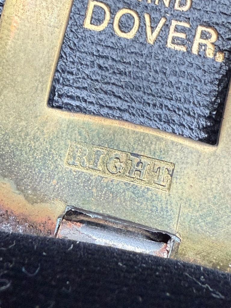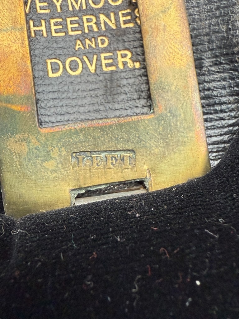 Zowel “LEFT” als “RIGHT” zijn op de bevestigingen geslagen. De stevige metalen draagkist met messing sluiting en handgreep is aan de binnenzijde bekleed met rood fluweel, dat ondanks sporen van ouderdom nog intact is.