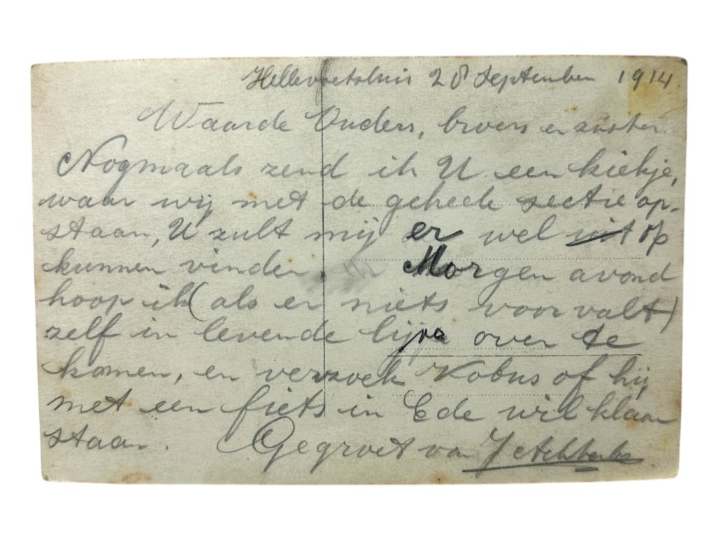 De foto is afgedrukt op postkaart formaat en beschreven aan de achterzijde en de militair stuurde deze foto naar zijn familie.