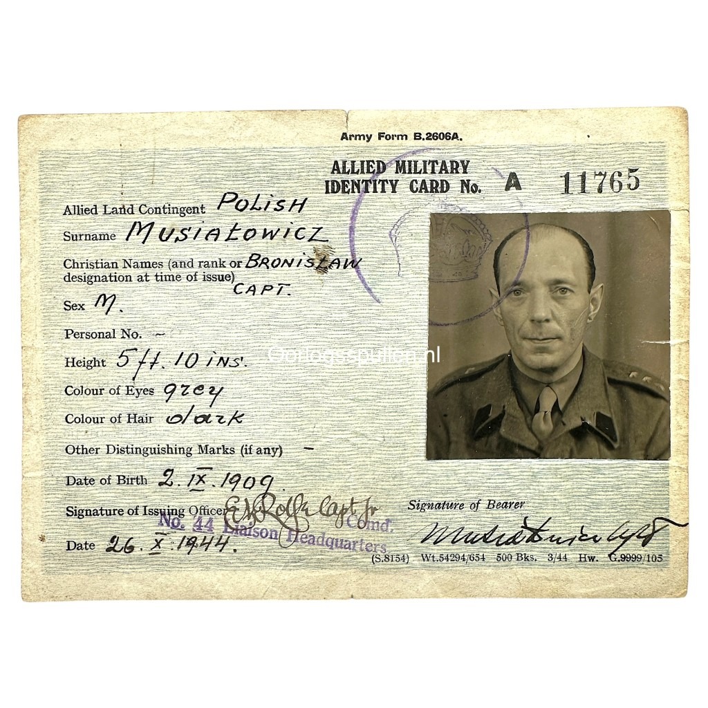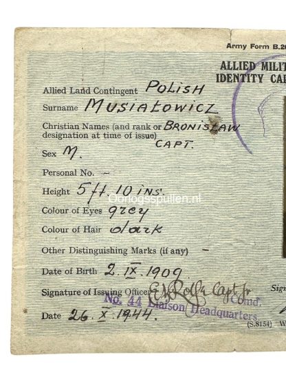 Originele WWII Geallieerde identificatiekaart van Poolse kapitein uit 1944