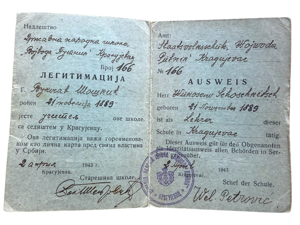 Originele Ausweis / legitimatiekaart uit de Tweede Wereldoorlog, uitgegeven op 2 april 1943 in Kragujevac (Servië), compleet met originele pasfoto, handgeschreven gegevens, officiële stempels en handtekeningen. De kaart is tweetalig opgesteld (Servisch/Duits) en werd verstrekt aan Vukosav B. Šoškrić (in het Duits genoteerd als Vukosav Schoeschreisch), leraar, geboren op 21 november 1889. Dit document diende tijdens de bezettingsperiode als officieel identiteitsbewijs tegenover de autoriteiten. Een bijzonder en zeldzaam historisch object dat een tastbare inkijk geeft in het dagelijks leven en de administratieve realiteit tijdens de Tweede Wereldoorlog, interessant voor verzamelaars van WOII-militaria en historische documenten.