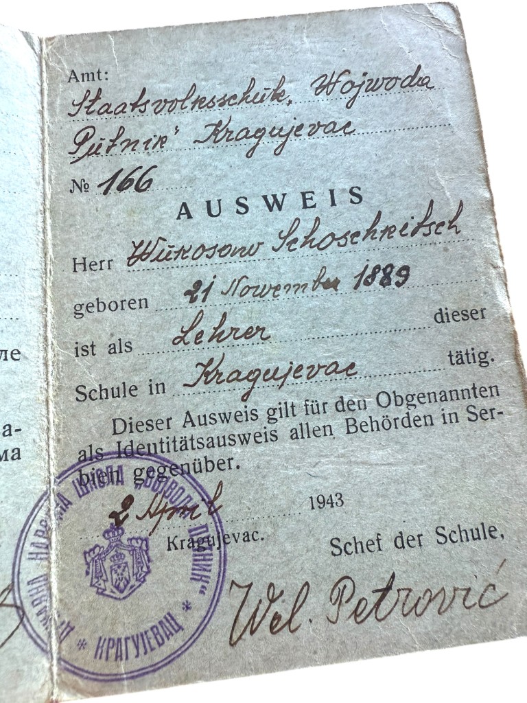 Originele WWII Duitse Ausweis uit Kragujevac (Serbia) in 1943