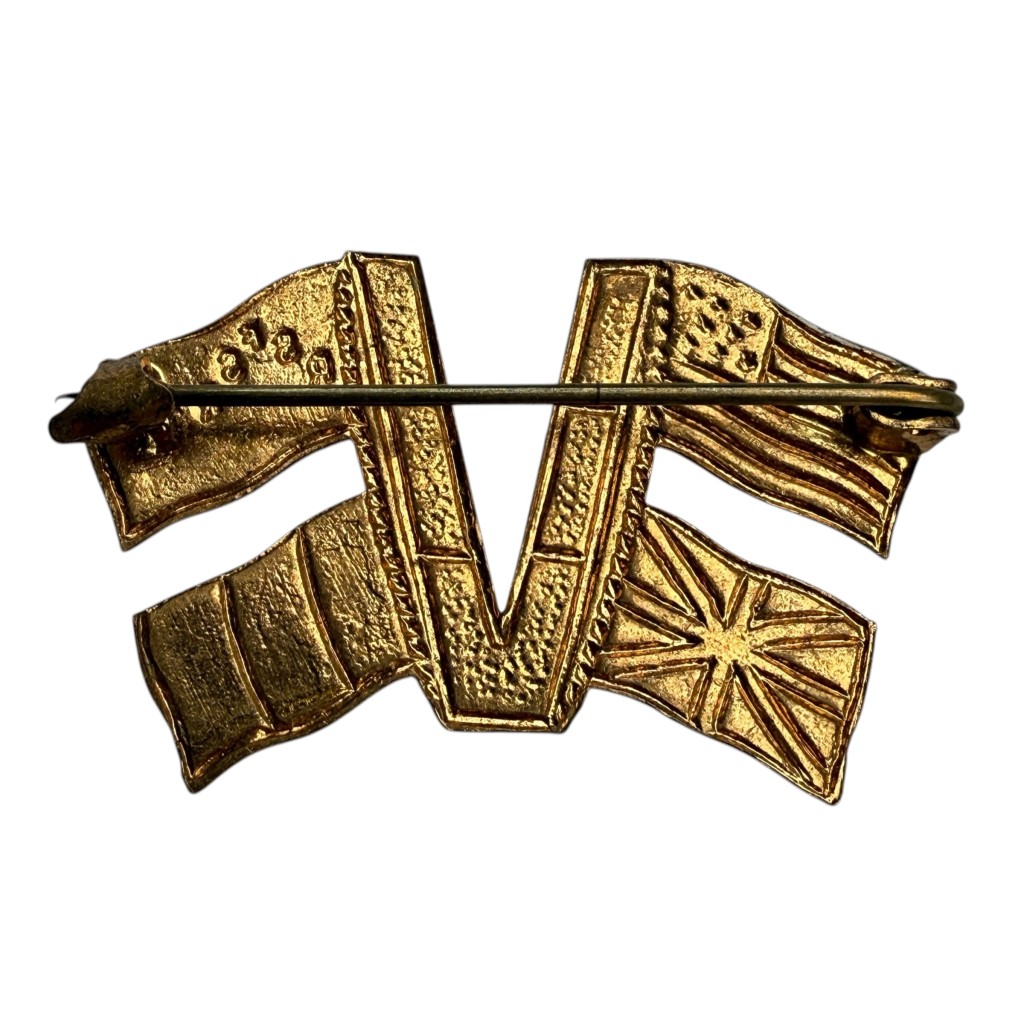Deze speld toont een centrale V voor overwinning gecombineerd met meerdere geallieerde vlaggen waaronder België, Verenigd Koninkrijk, Verenigde Staten en Sovjet-Unie.