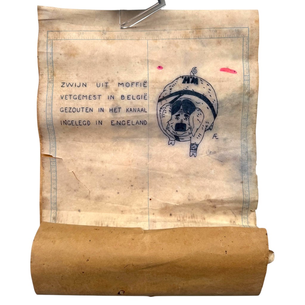 Naast de illustratie staat de tekst Zwijn uit Moffië vetgemest in België gezouten in het kanaal ingelegd in Engeland.