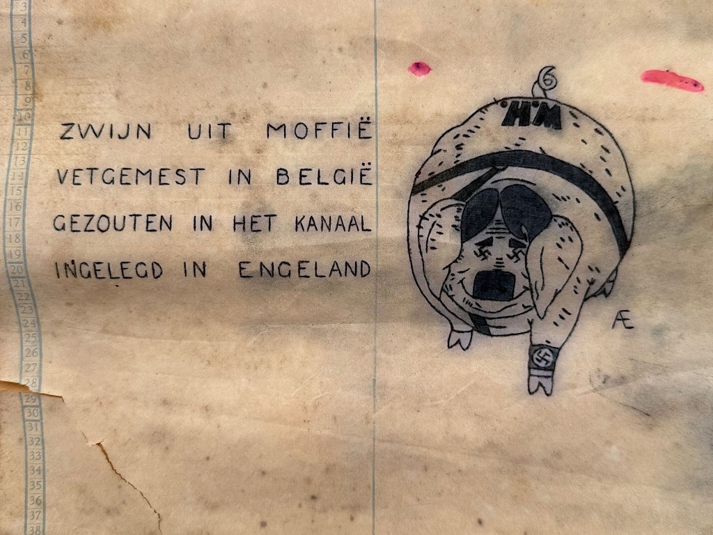 De tekening toont een karikaturaal zwijn met nazi-symboliek als verwijzing naar de Duitse bezetter.