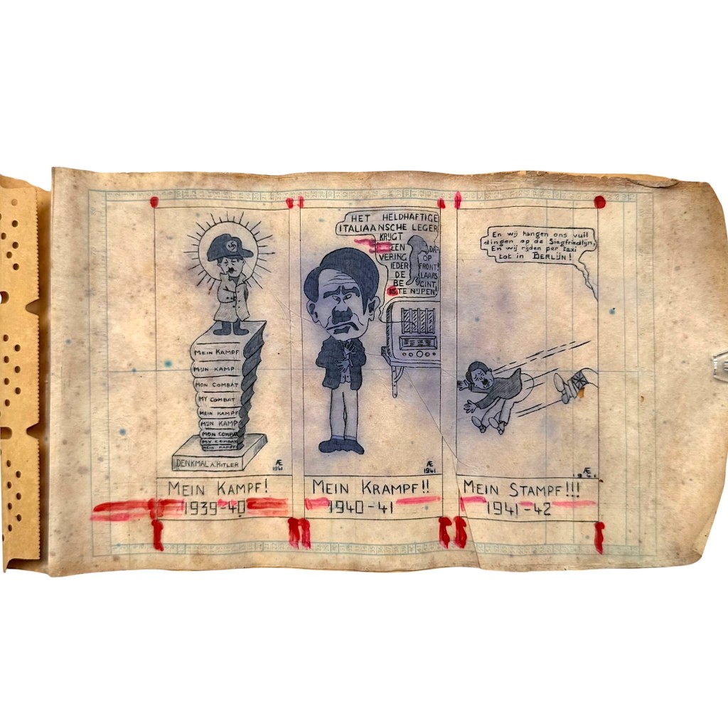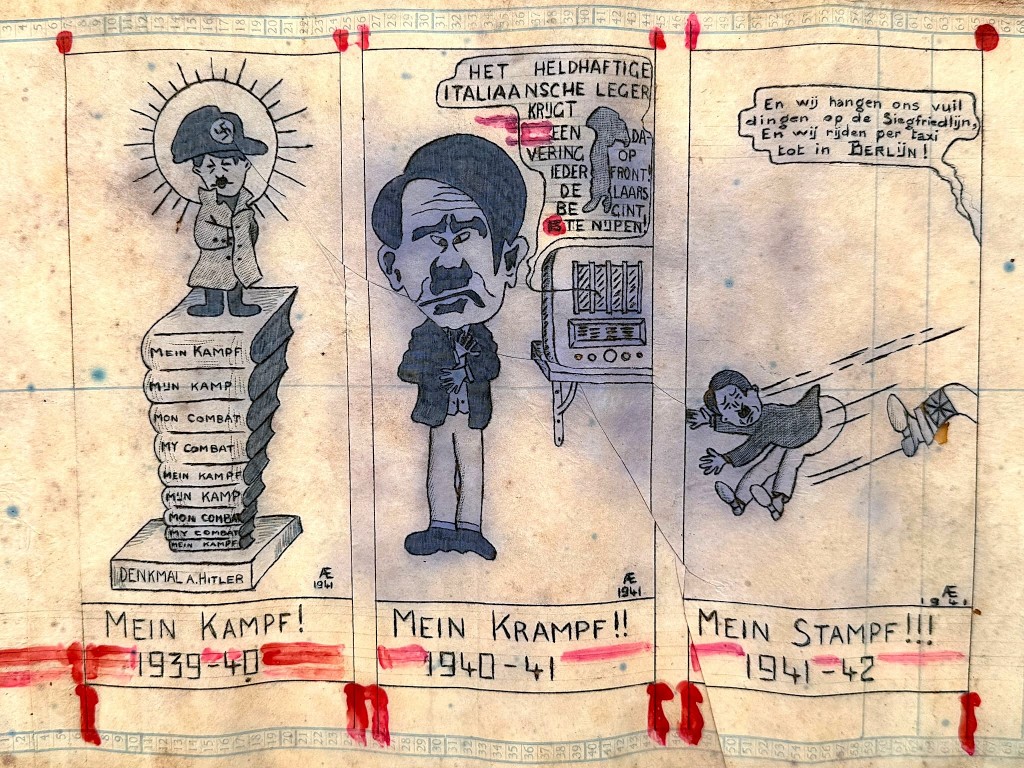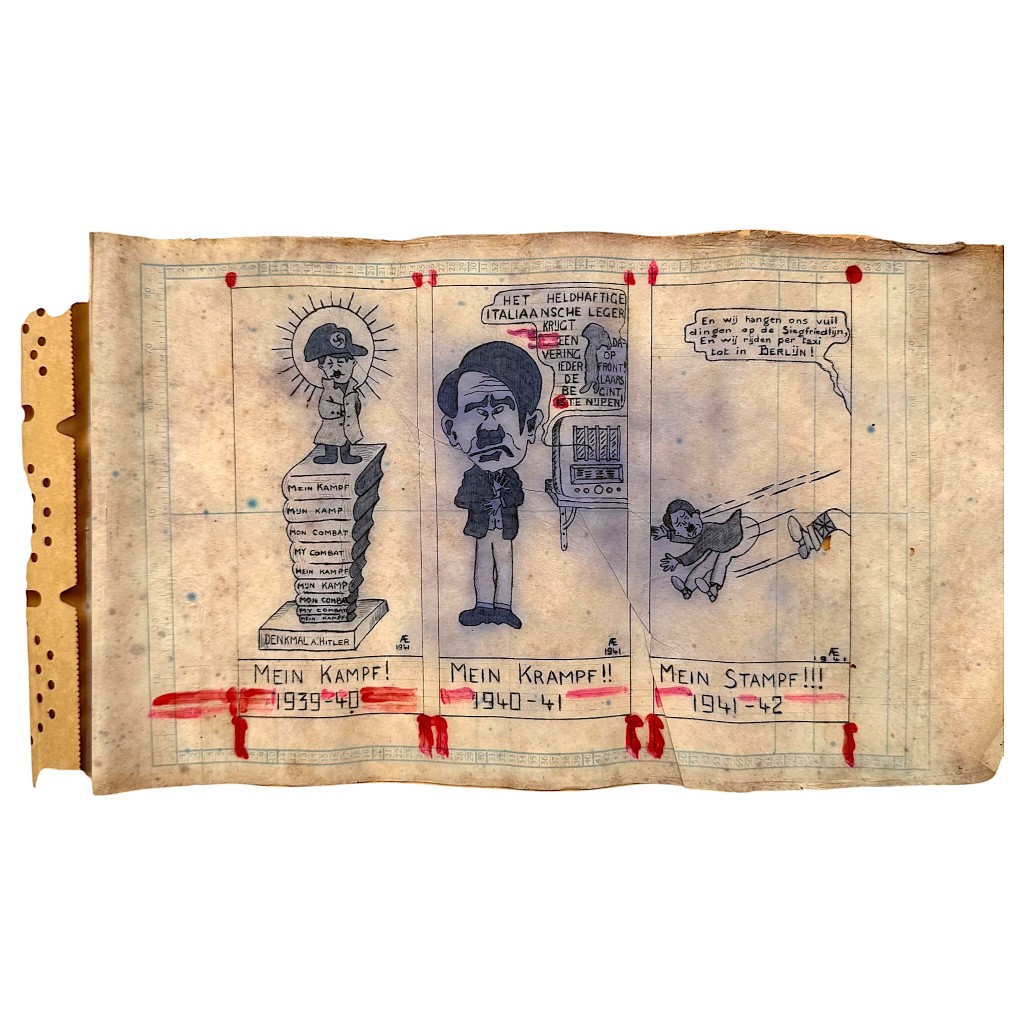 De tekening bestaat uit drie panelen met de titels Mein Kampf Mein Krampf en Mein Stampf met jaartallen 1939-1942.