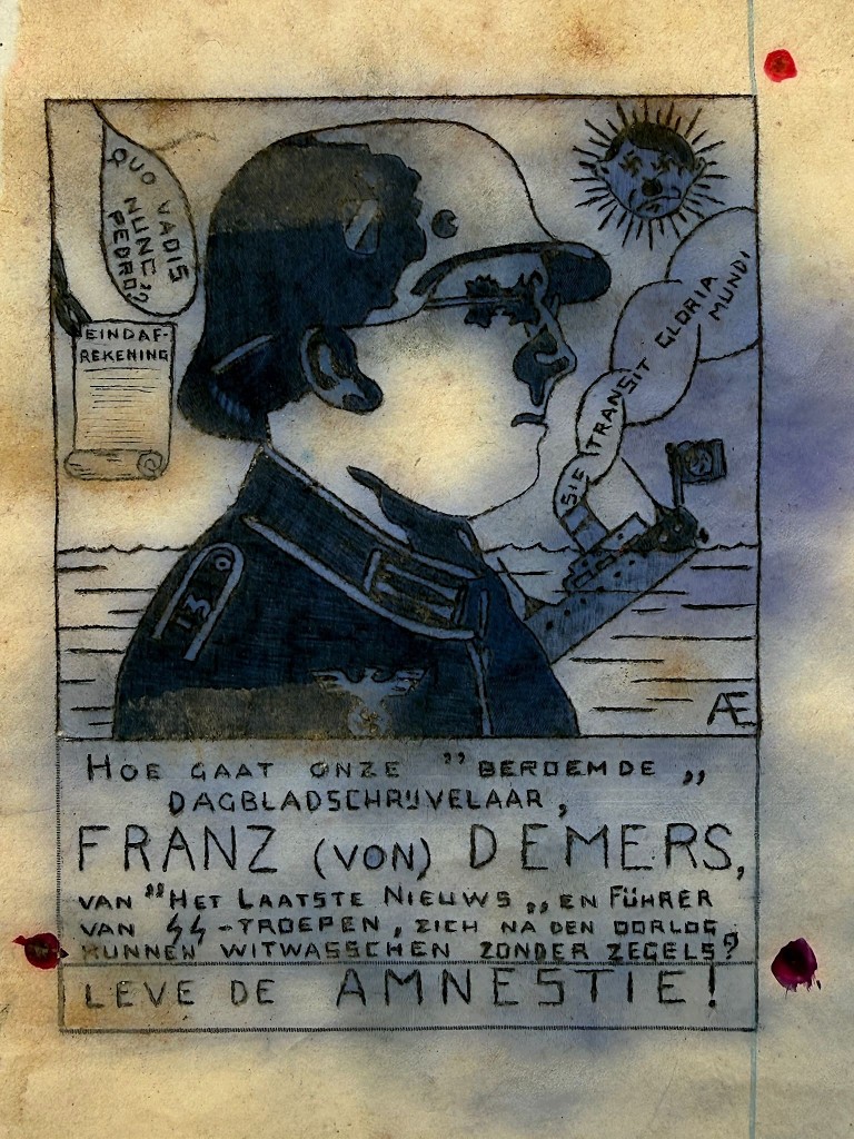 Originele Belgische verzet spottekening gericht tegen de schrijver Franz von Demers uit de periode van de Tweede Wereldoorlog.