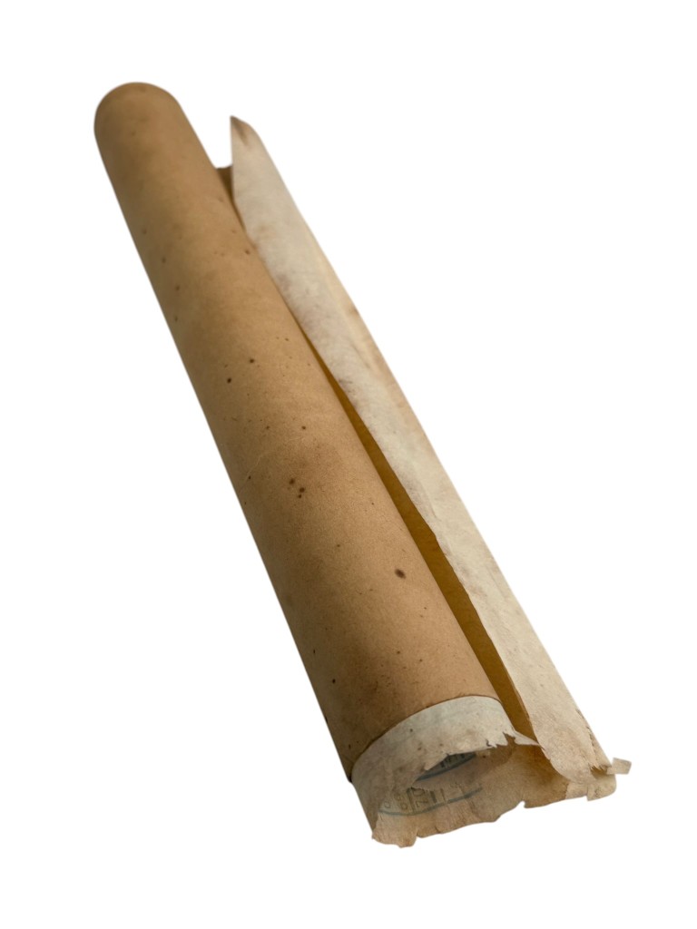 Het geheel werd bewaard in opgerolde vorm zoals zichtbaar op de achterzijde.
