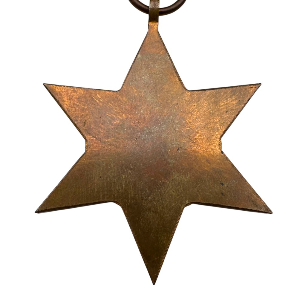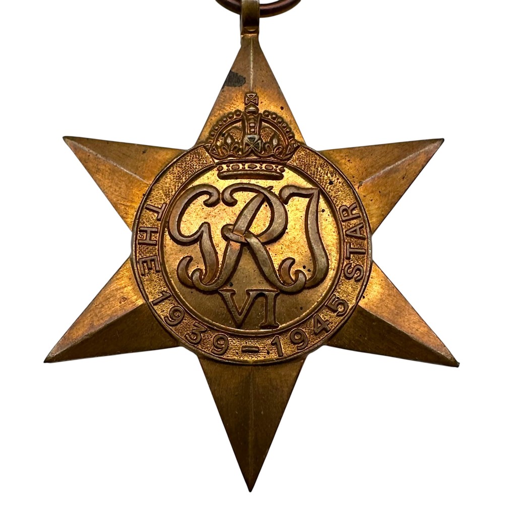 The star-shaped medal is made of bronze and is suspended from the distinctive ribbon in dark blue, red and light blue. The obverse features the royal cypher of King George VI with crown, surrounded by the inscription “THE 1939–1945 STAR”. The reverse is plain, as is standard for this award.