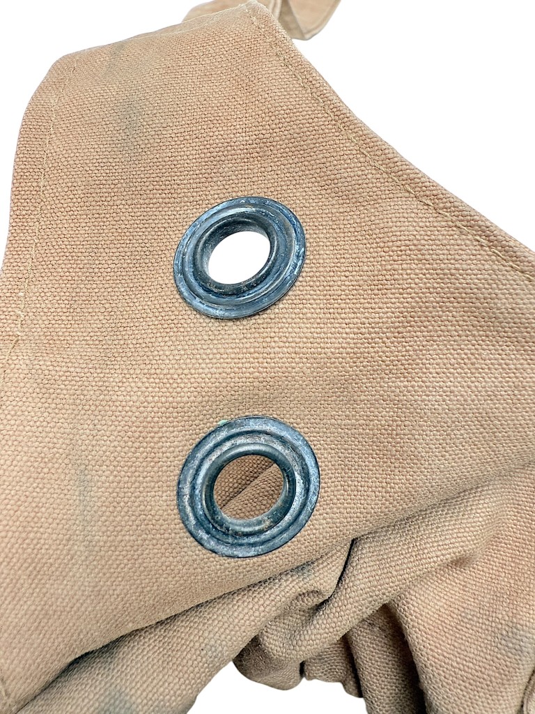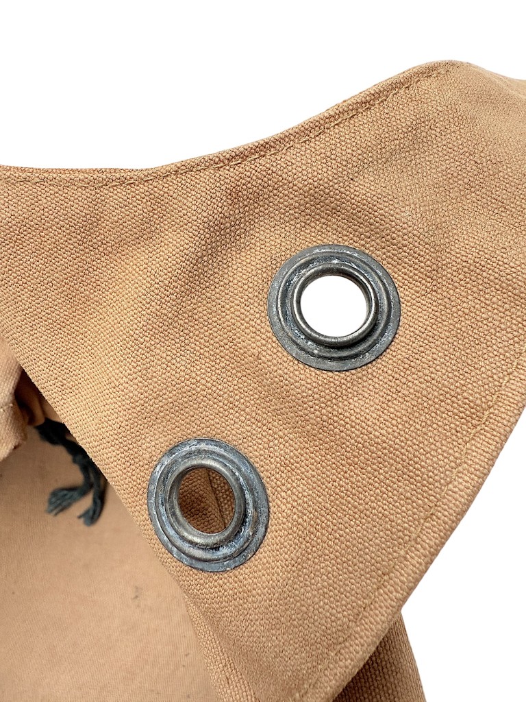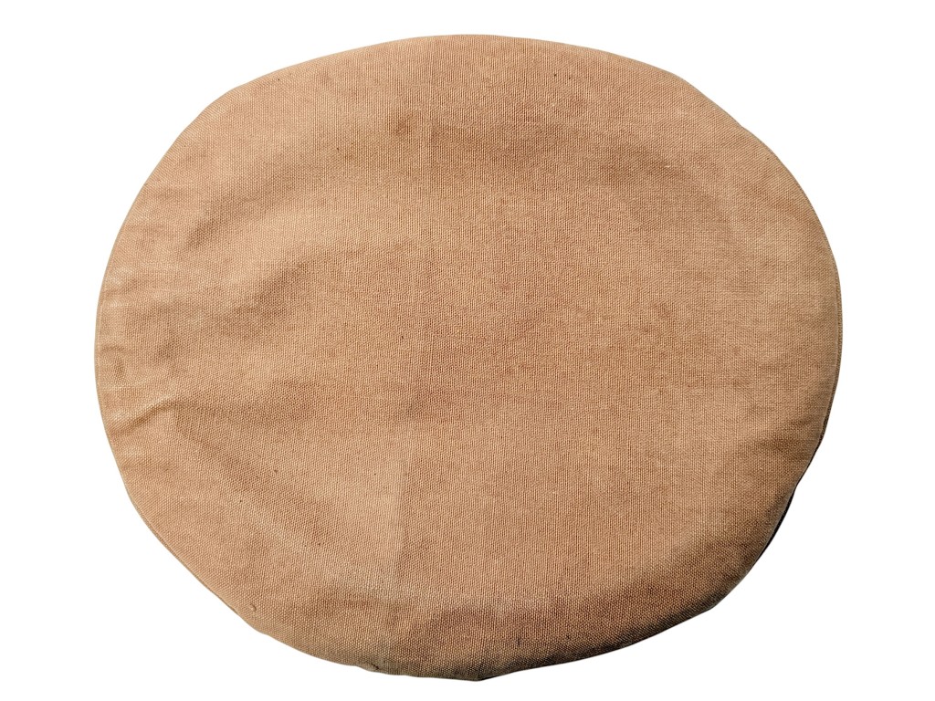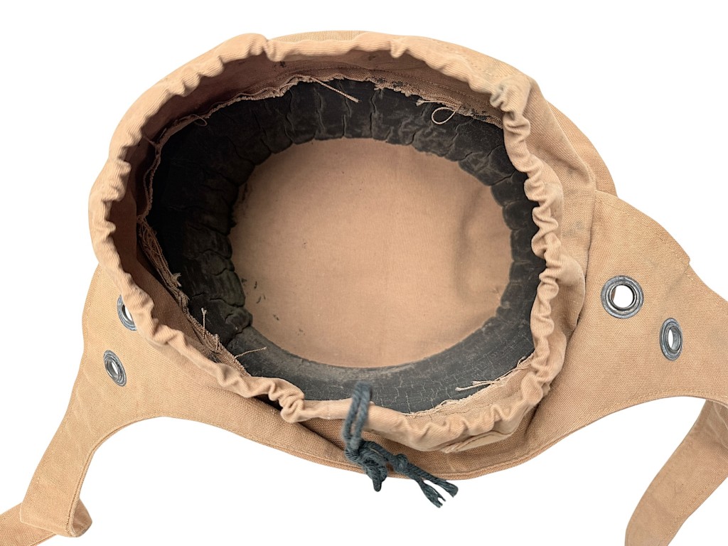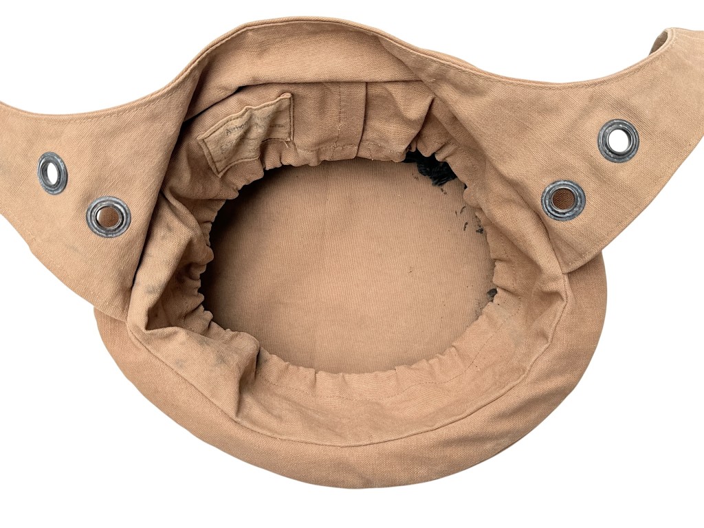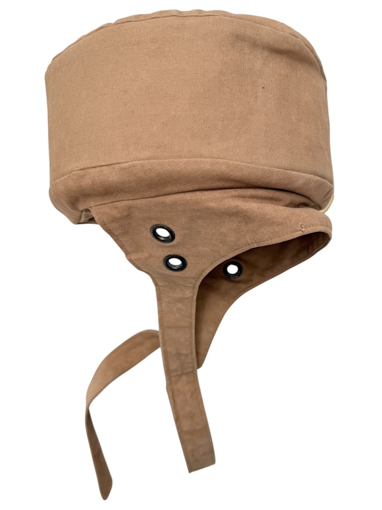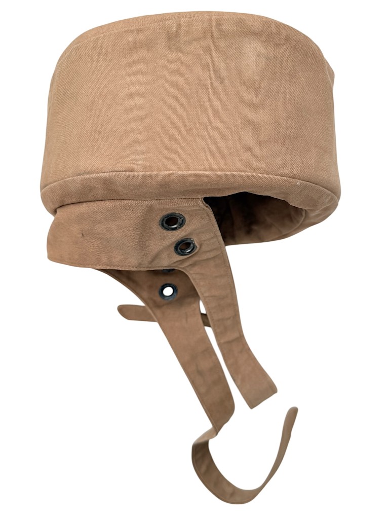 The helmet is made of sturdy light-brown canvas, featuring the characteristic elastic rim and adjustable straps for a secure fit.