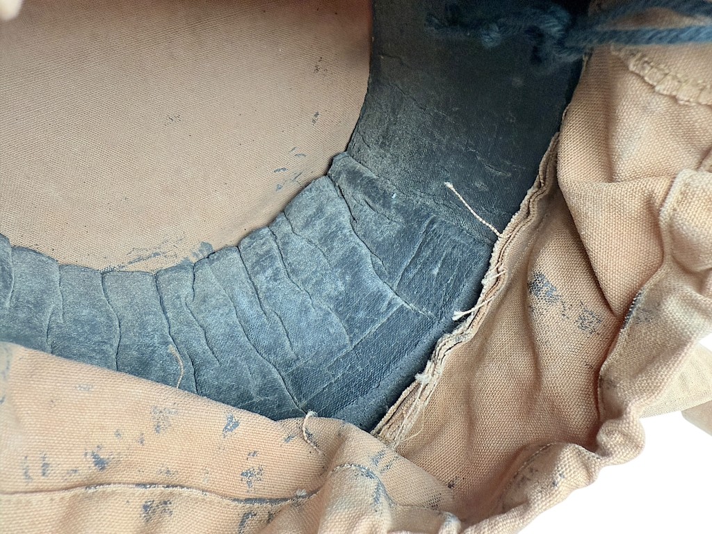 Inside is the original protective padding ring, designed to absorb impact during training exercises, and the manufacturer’s label with size and year remains clearly visible.