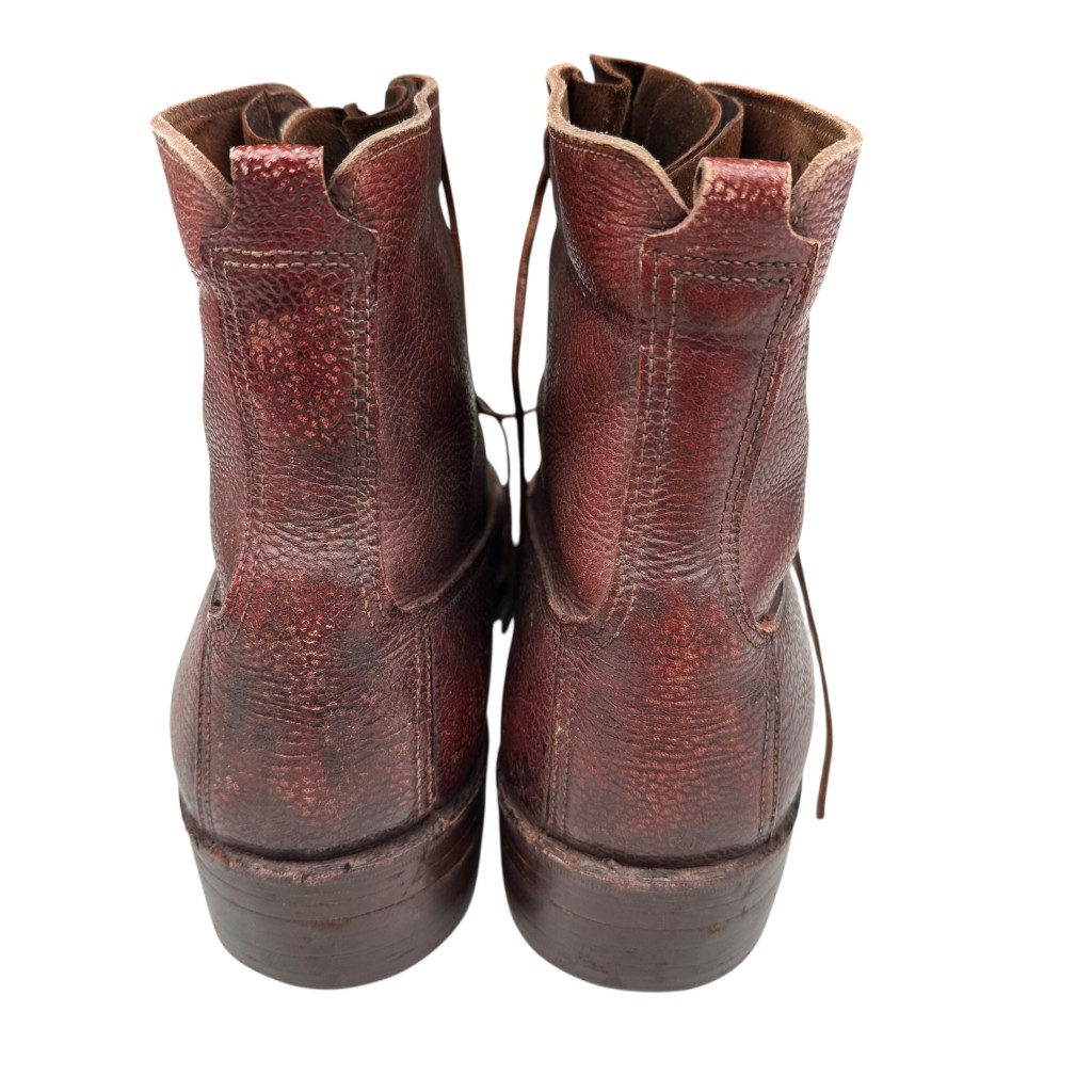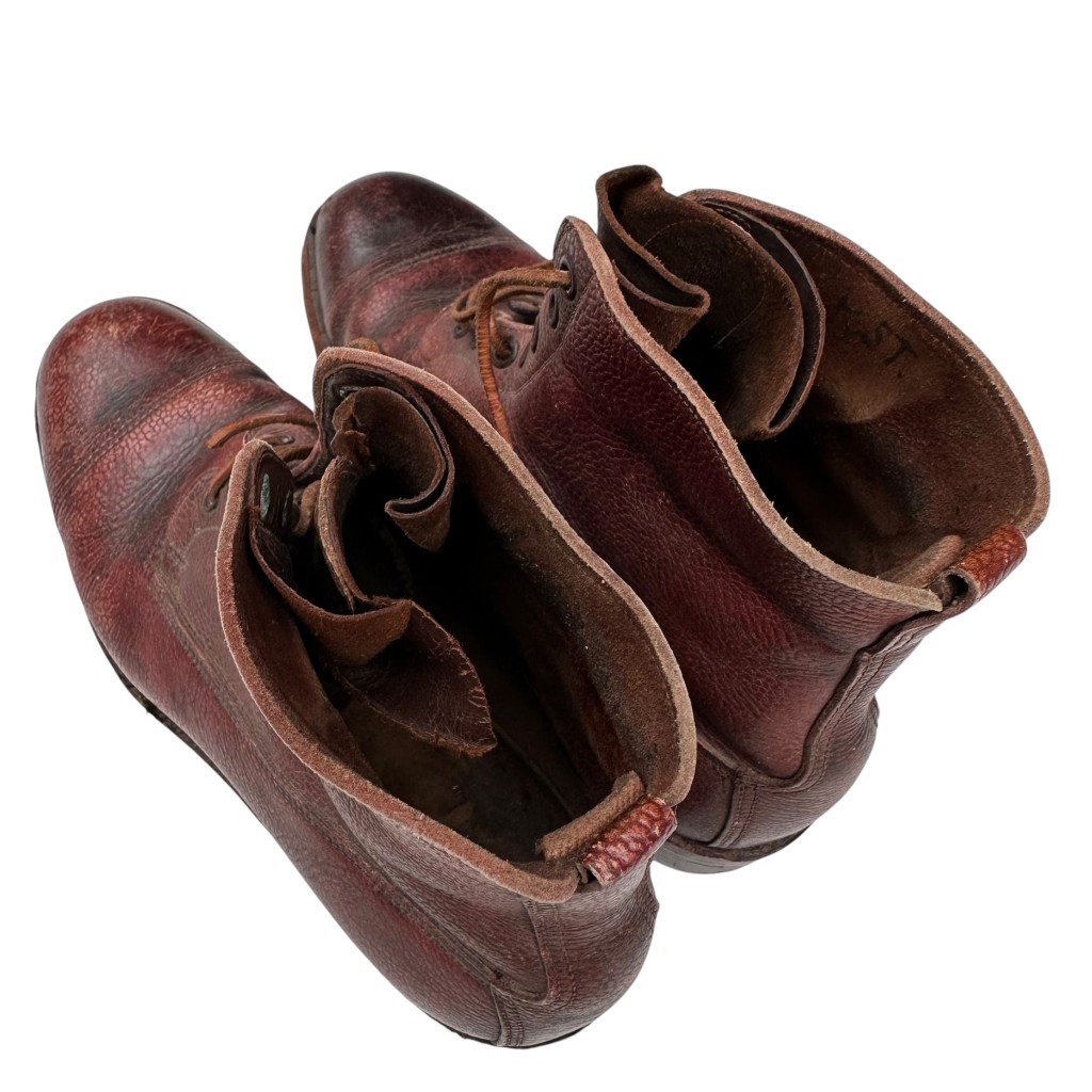 Origineel paar Britse leger officiers ‘Ankle Boots’ uit de Tweede Wereldoorlog, uitgevoerd in bruin leder met klassieke vetersluiting. Deze enkellaarzen werden gedragen door officieren van het Britse leger tijdens de jaren 1939–1945. De schoenen zijn voorzien van een verstevigde neus, stevige hak en originele leren zolen met metalen studs (hobnails). Een bijzonder verzamelobject voor liefhebbers van Britse militaria of Tweede Wereldoorlog schoeisel.