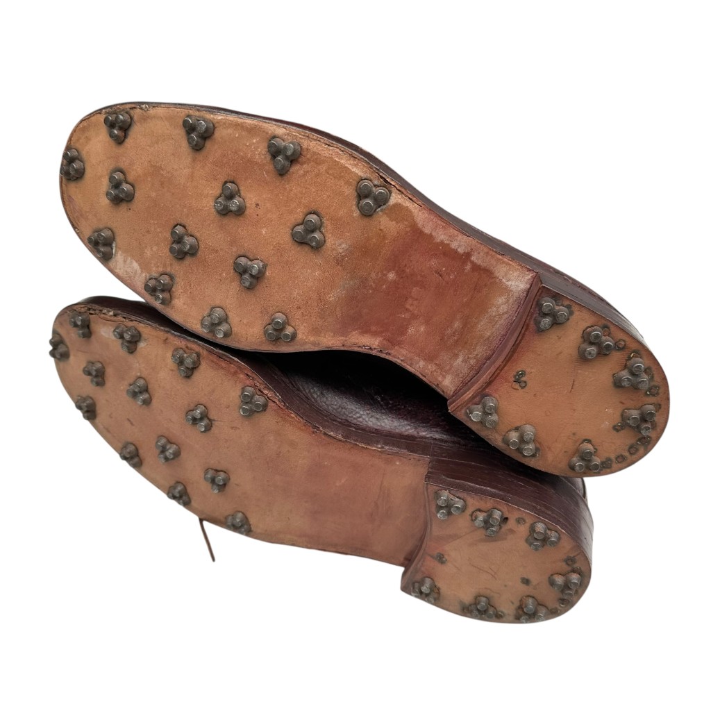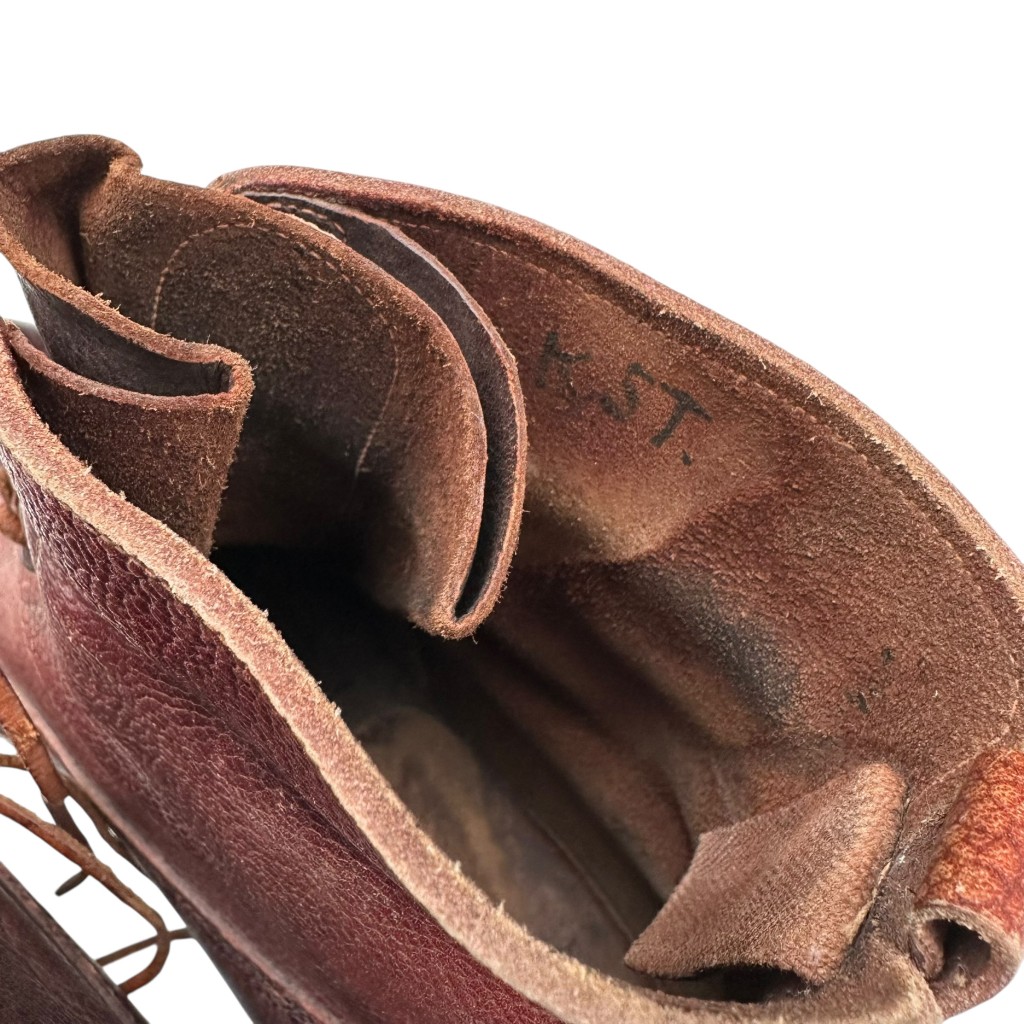 Original pair of British Army officers’ “Ankle Boots” from the Second World War, made of brown leather with a classic lace-up closure. These ankle boots were worn by officers of the British Army during the years 1939–1945. The shoes feature a reinforced toe cap, sturdy heel, and original leather soles fitted with metal studs (hobnails).
