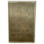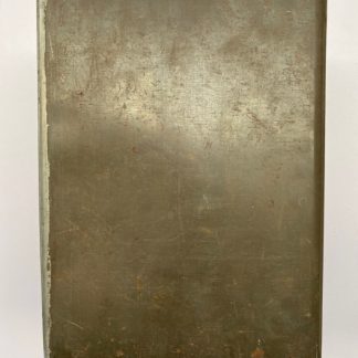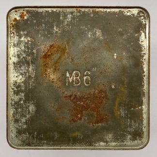 Het Britse biscuitblik is leeg en in gebruikte conditie, dateert uit 1944 en werd gebruikt tijdens de voedseldropping in Nederland gedurende de Tweede Wereldoorlog.
